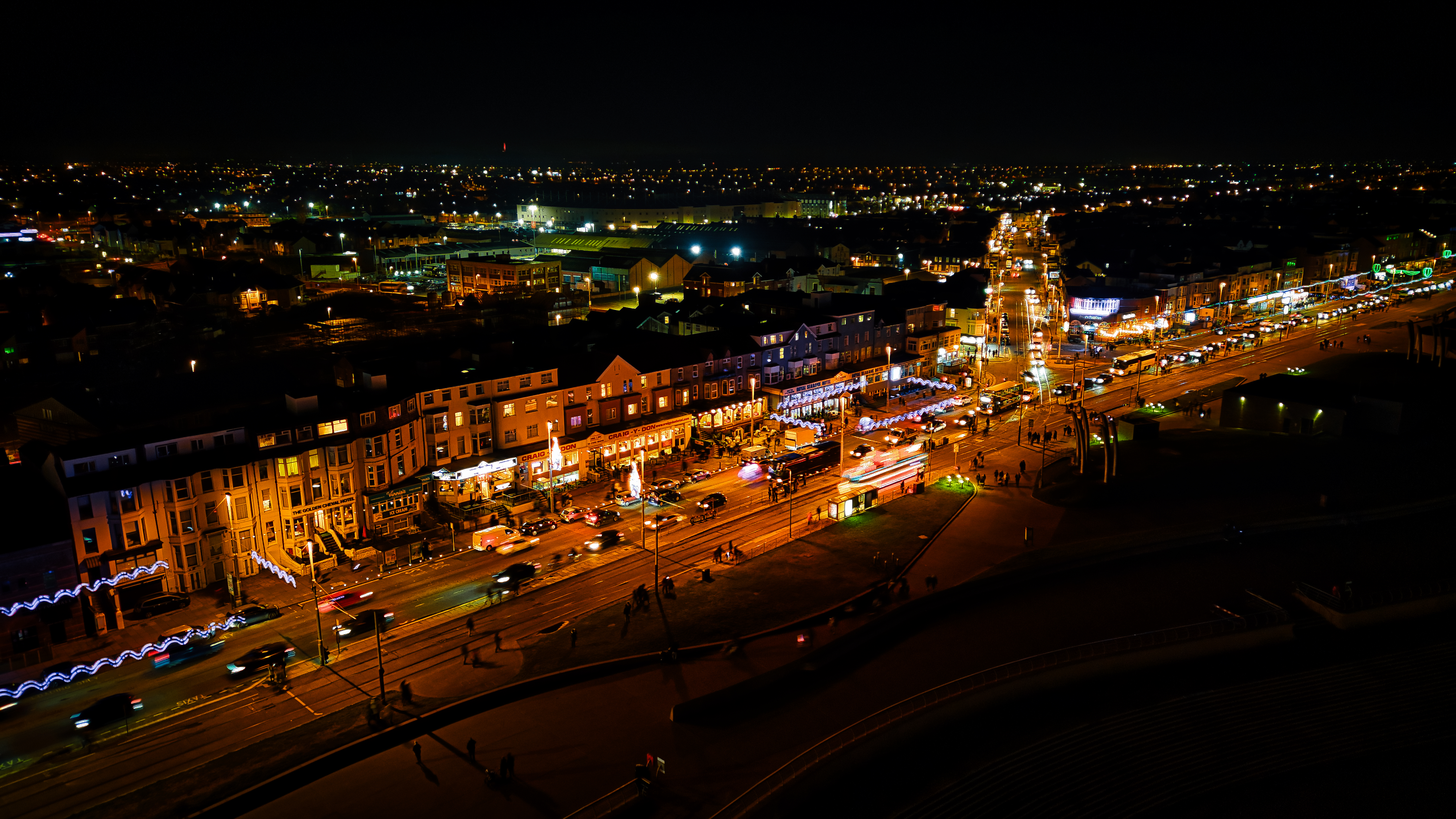 Aerial night view of a cityscape with illuminated streets and buildings in Backpool, England.