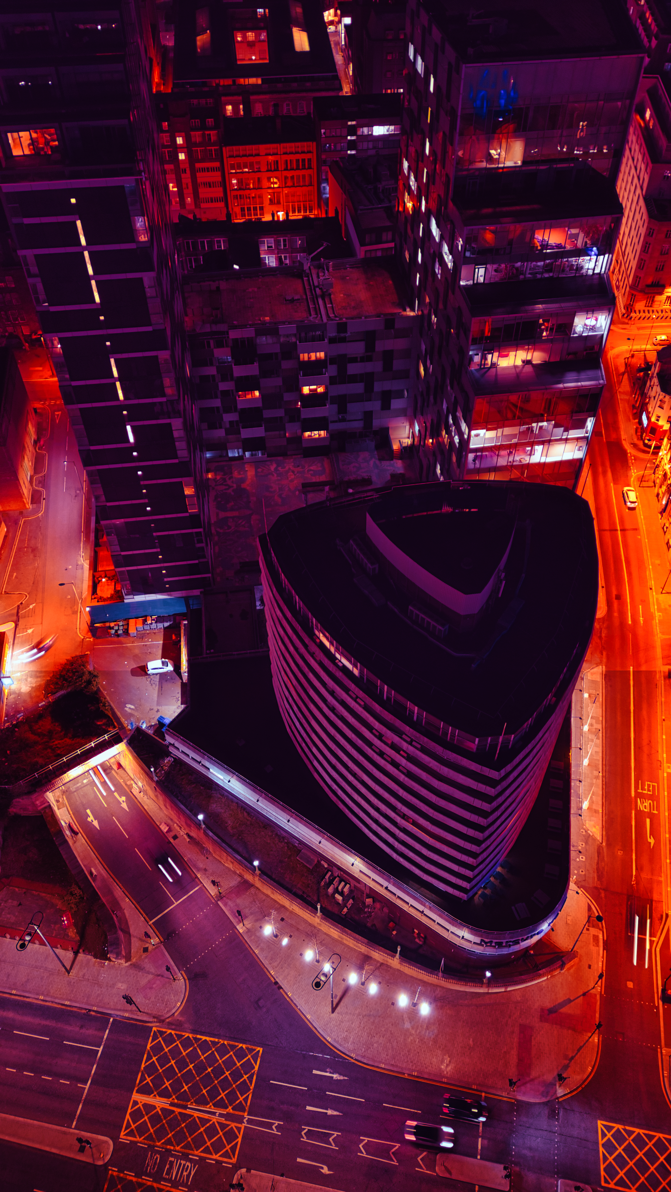 Aerial night view of a cityscape with illuminated streets and modern buildings, showcasing urban architecture and traffic in Liverpool, UK.