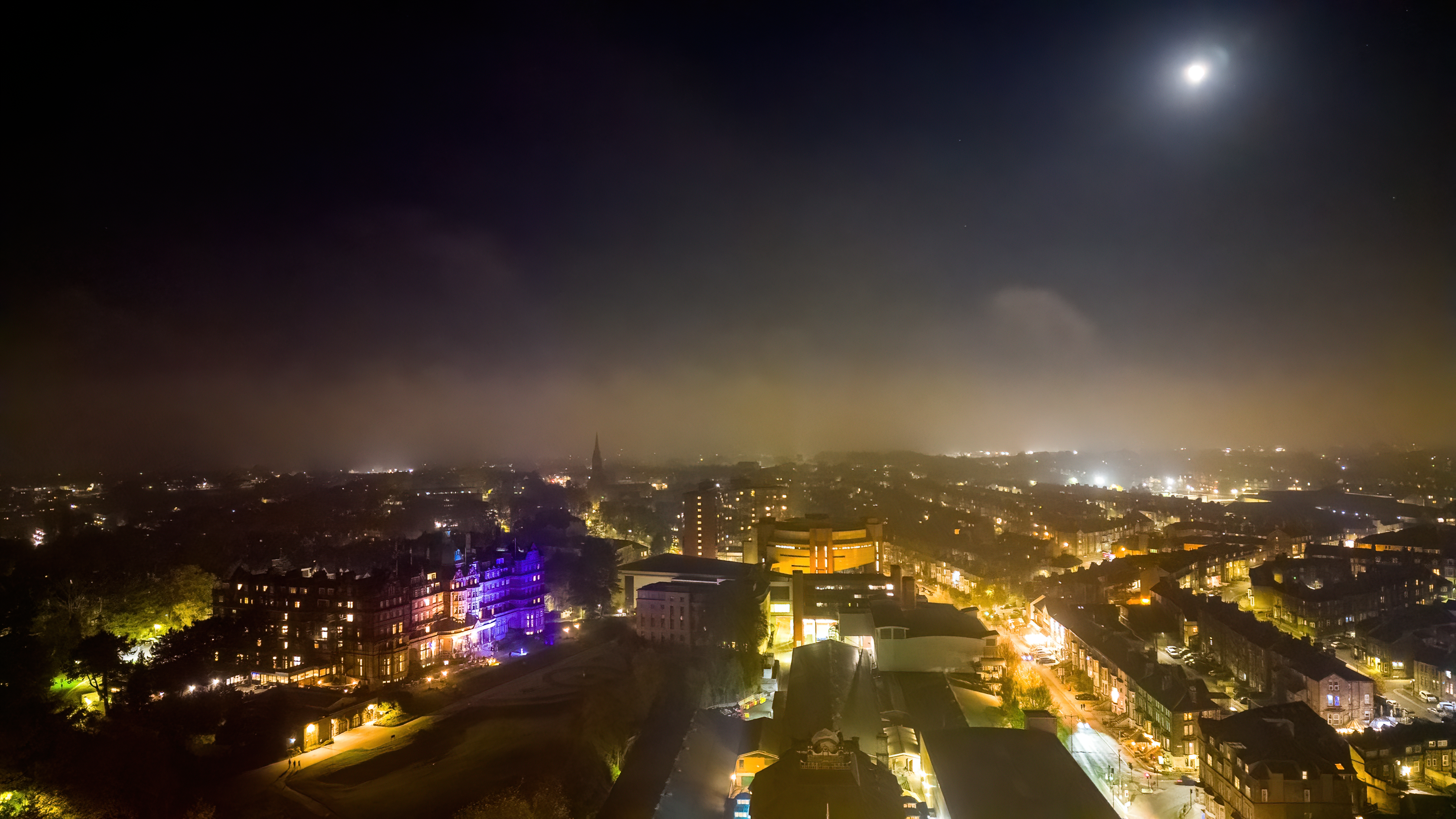 Aerial night view of a cityscape with illuminated streets under a moonlit sky in Harrogate, North Yorkshire.