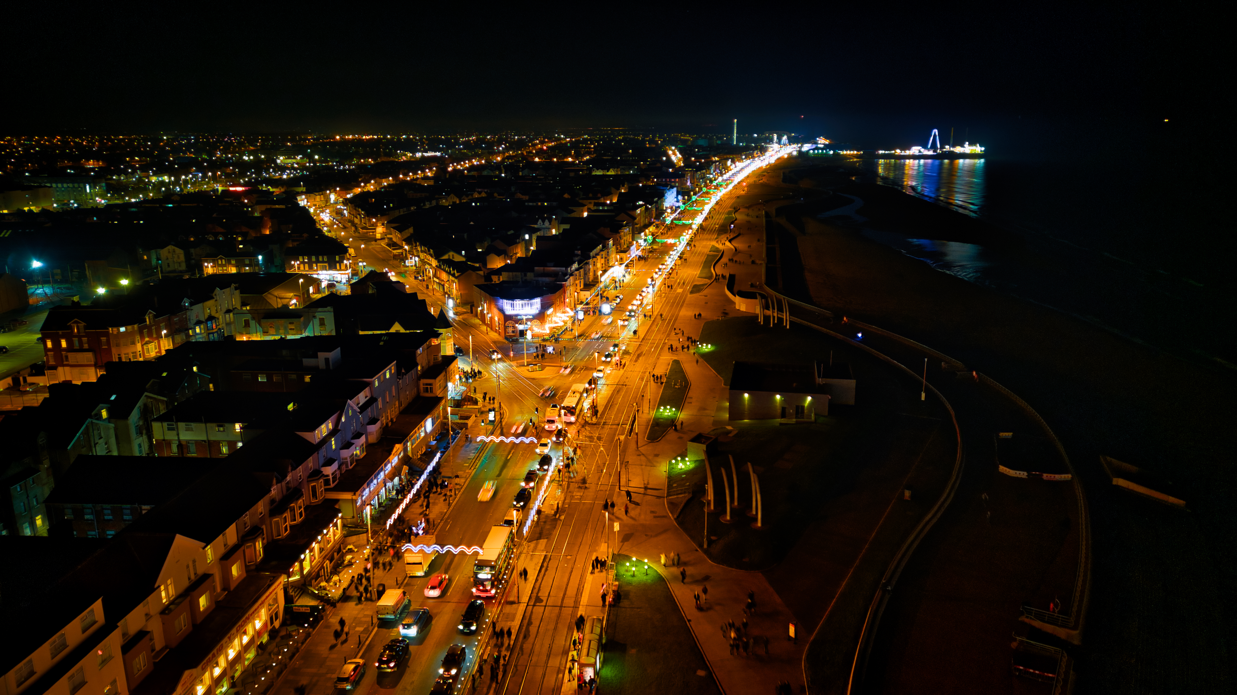 Aerial night view of a coastal city with illuminated streets and buildings, highlighting urban nightlife and infrastructure in Backpool, England.
