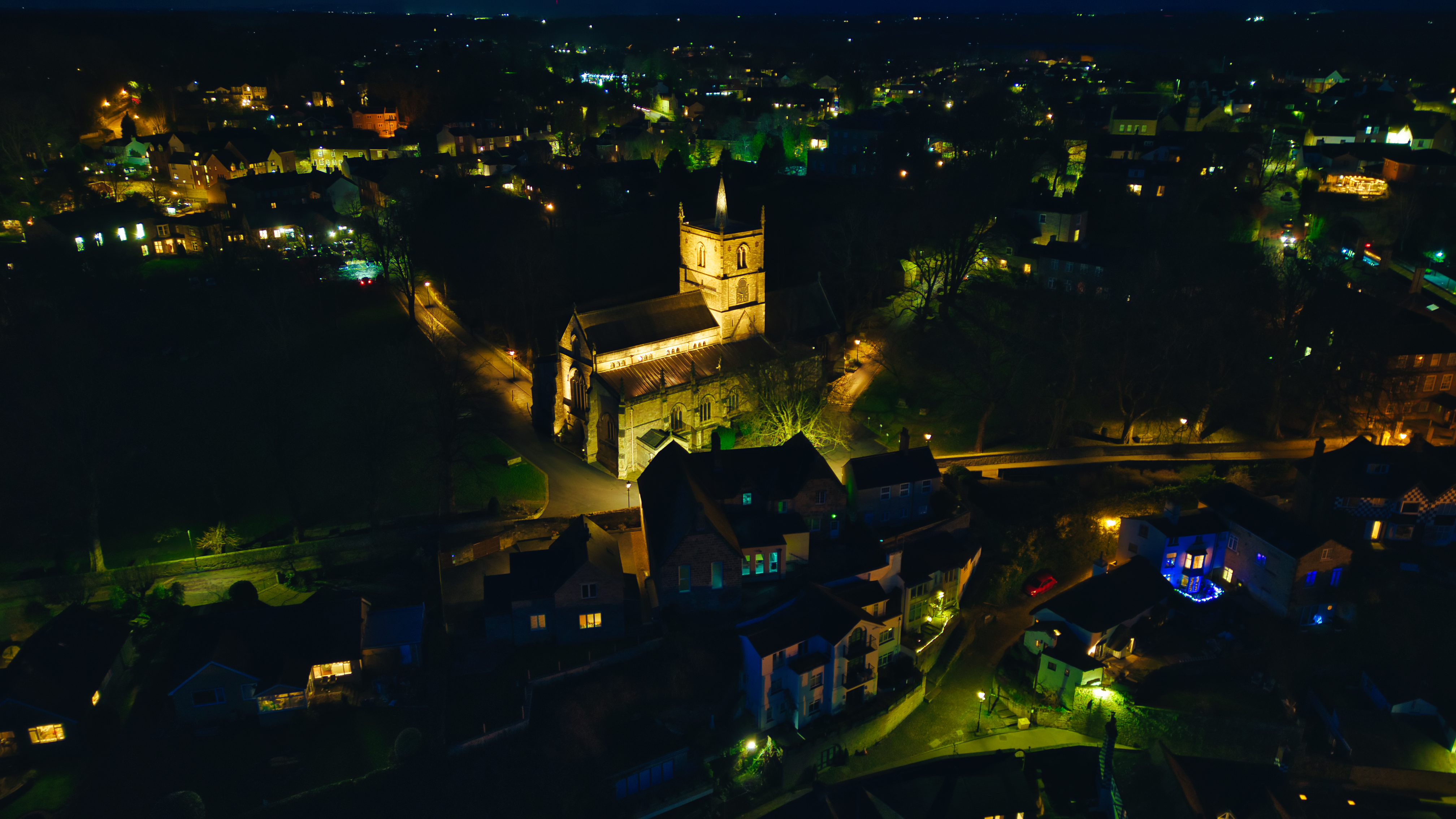 Aerial night view of a lit castle amidst a darkened town landscape in Knaresborough, North Yorkshire