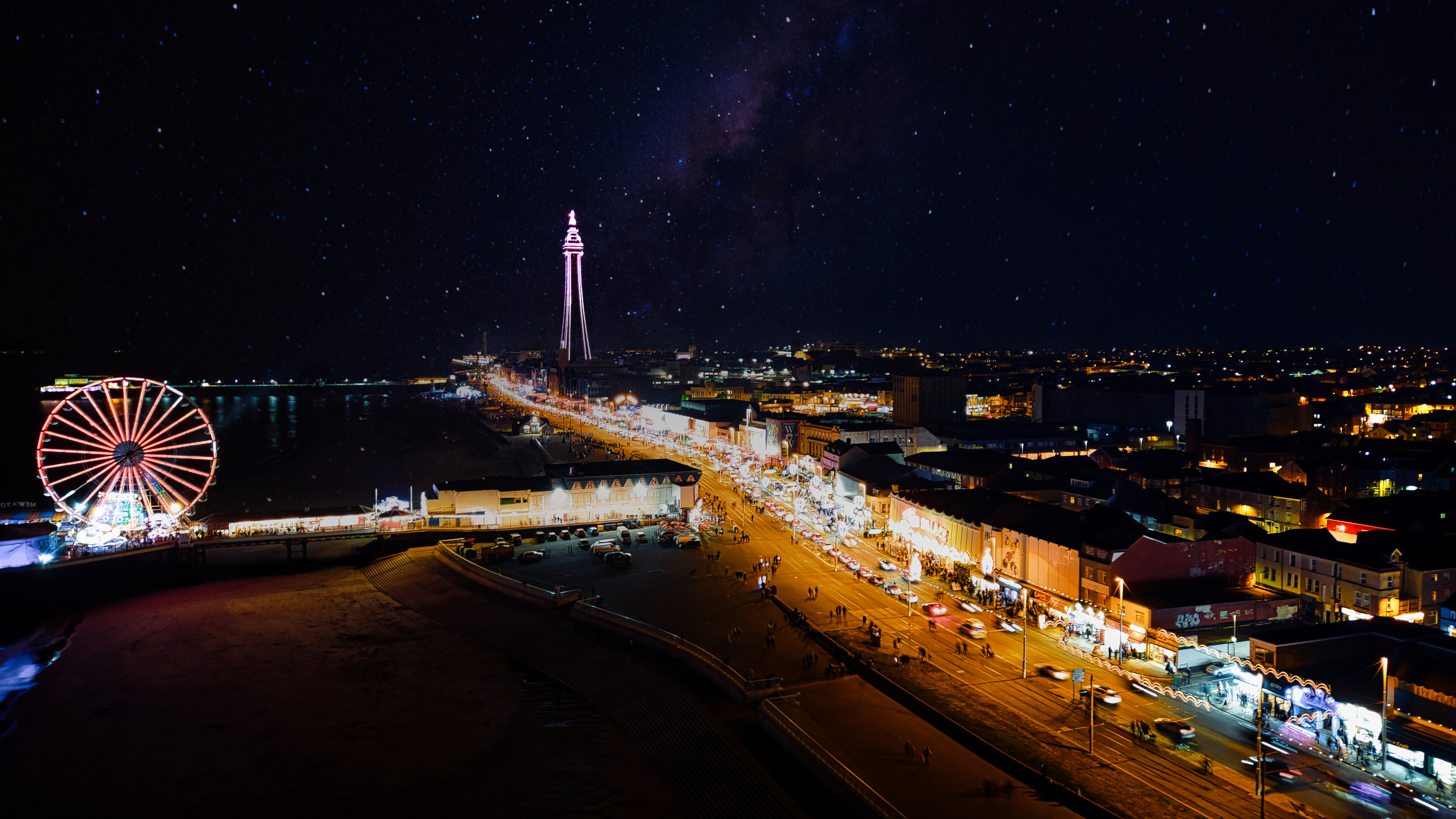 Aerial night view of a lit-up seaside town with a Ferris wheel and tower, under a starry sky in Backpool, England.