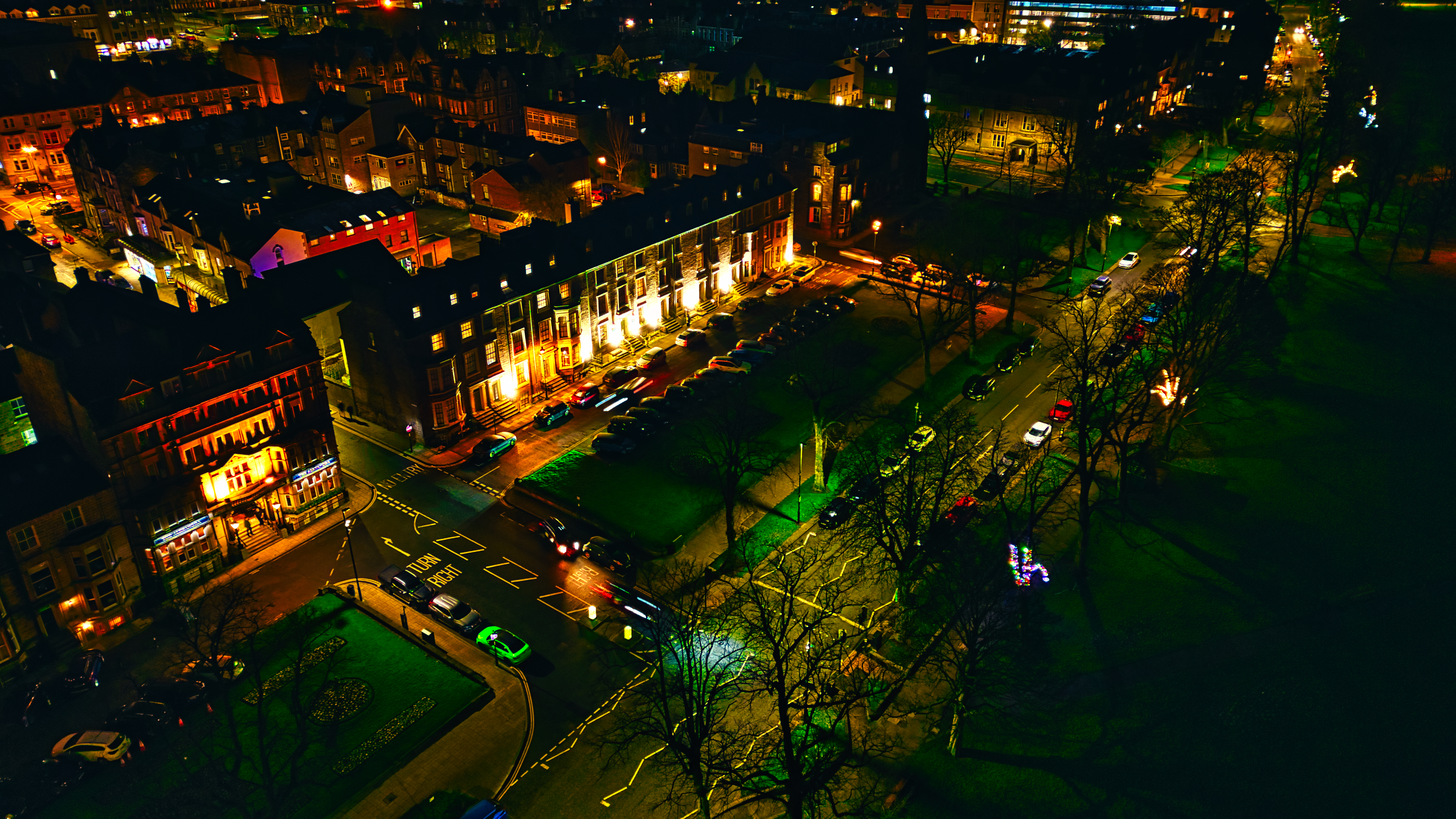 Aerial night view of a lit-up urban street with rows of buildings and trees in Harrogate, North Yorkshire.