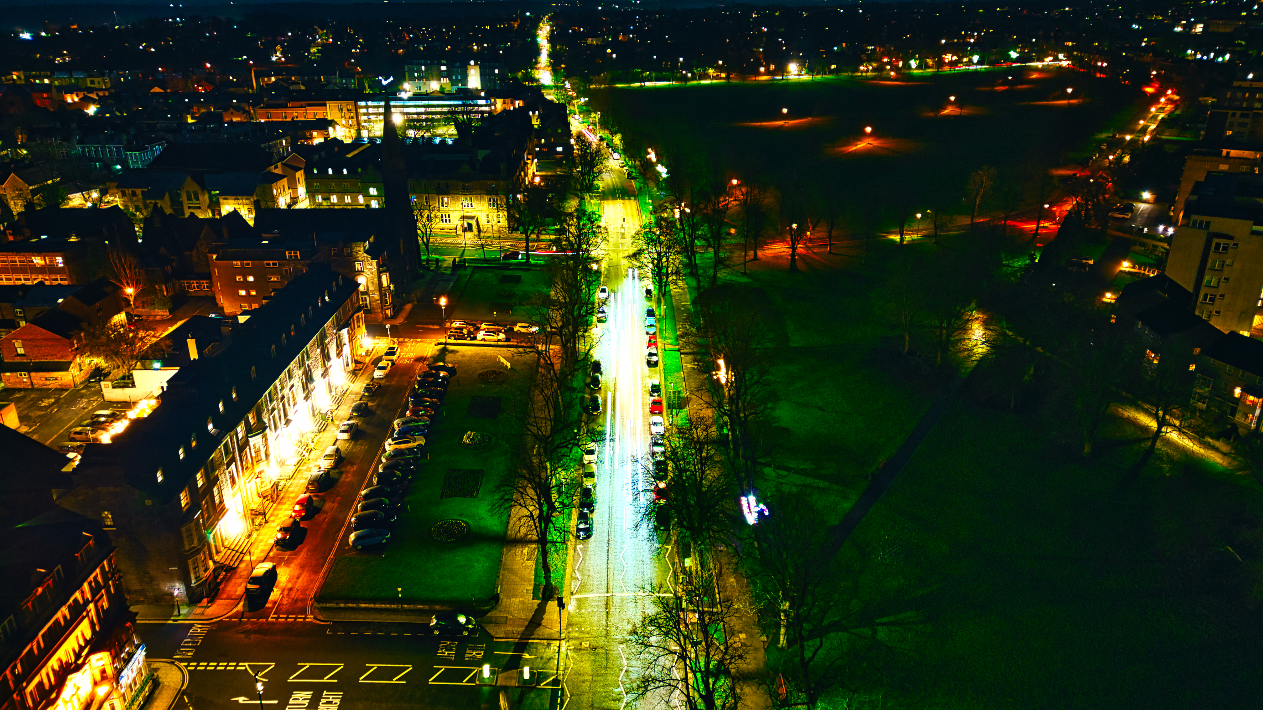 Aerial night view of a vibrant city street with illuminated buildings and traffic lights in Harrogate, North Yorkshire.