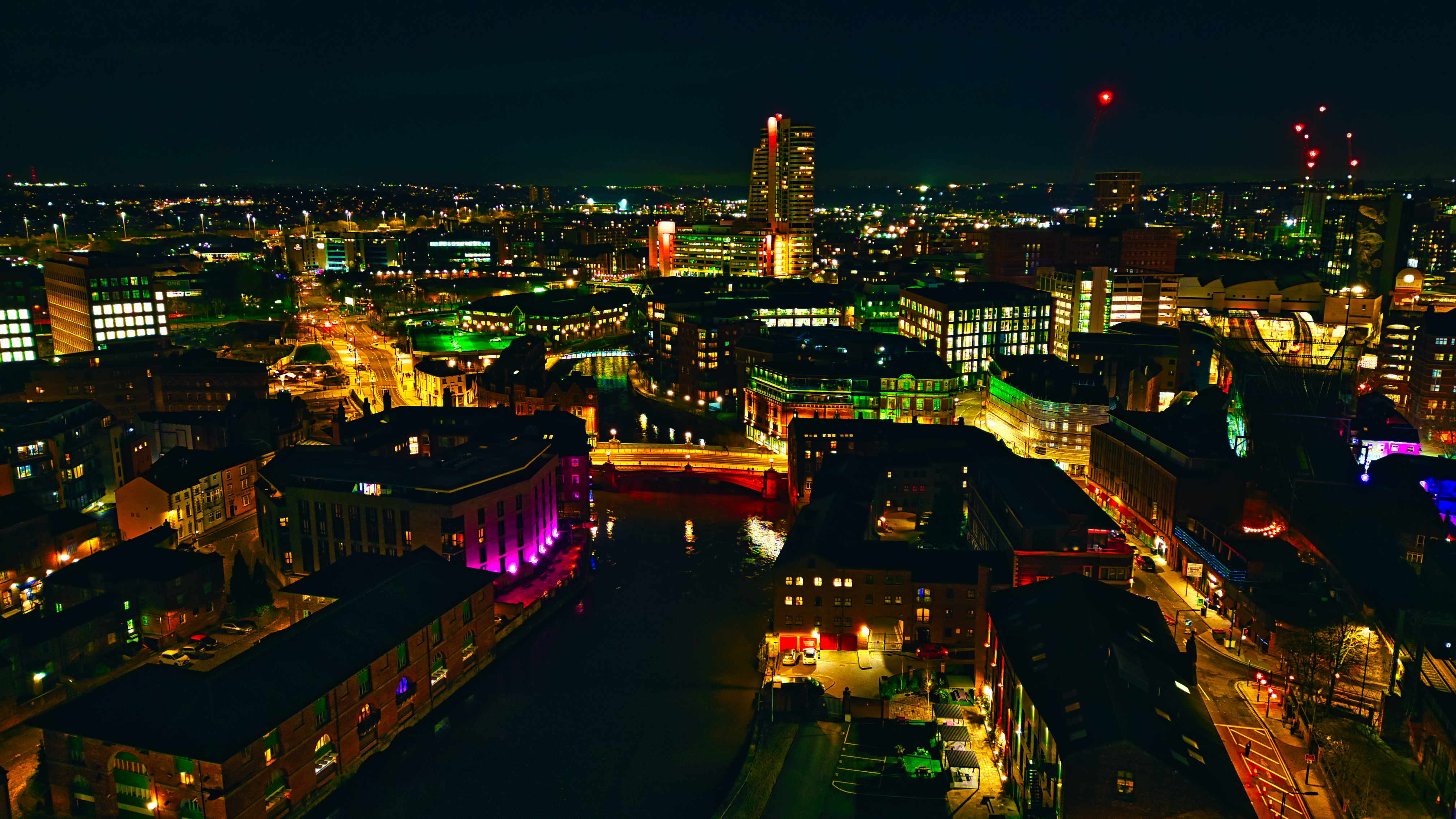 Aerial night view of a vibrant cityscape with illuminated buildings and streets in Leeds, UK.