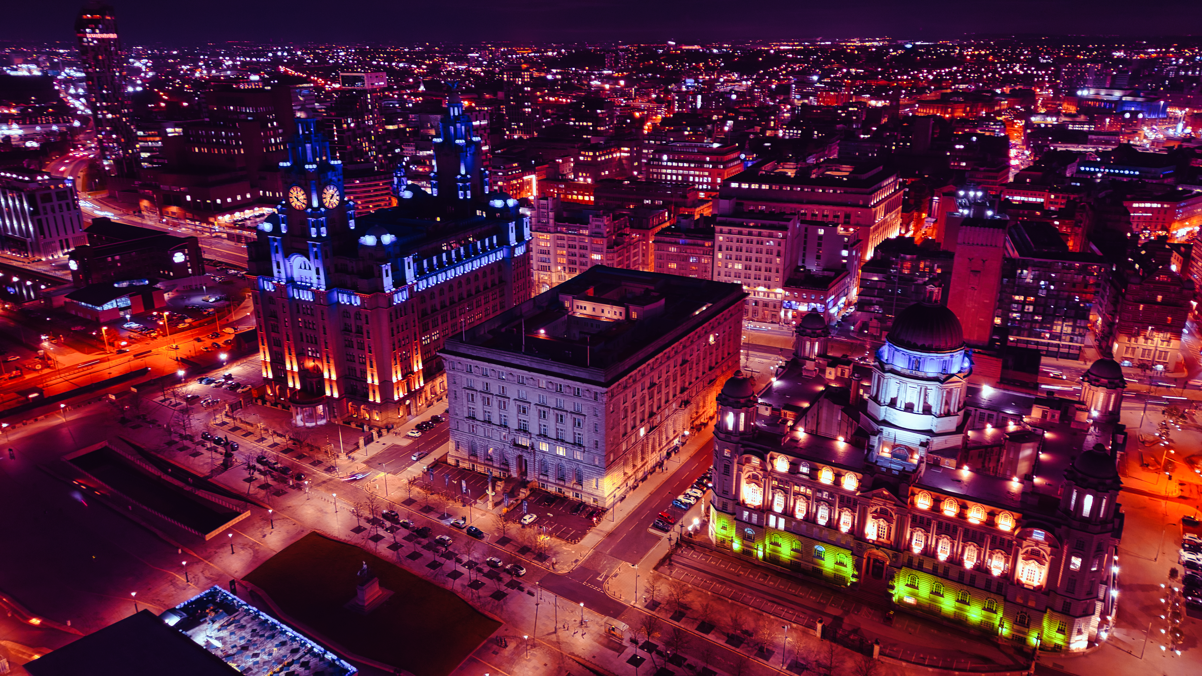 Aerial night view of a vibrant cityscape with illuminated buildings and streets in Liverpool, UK.