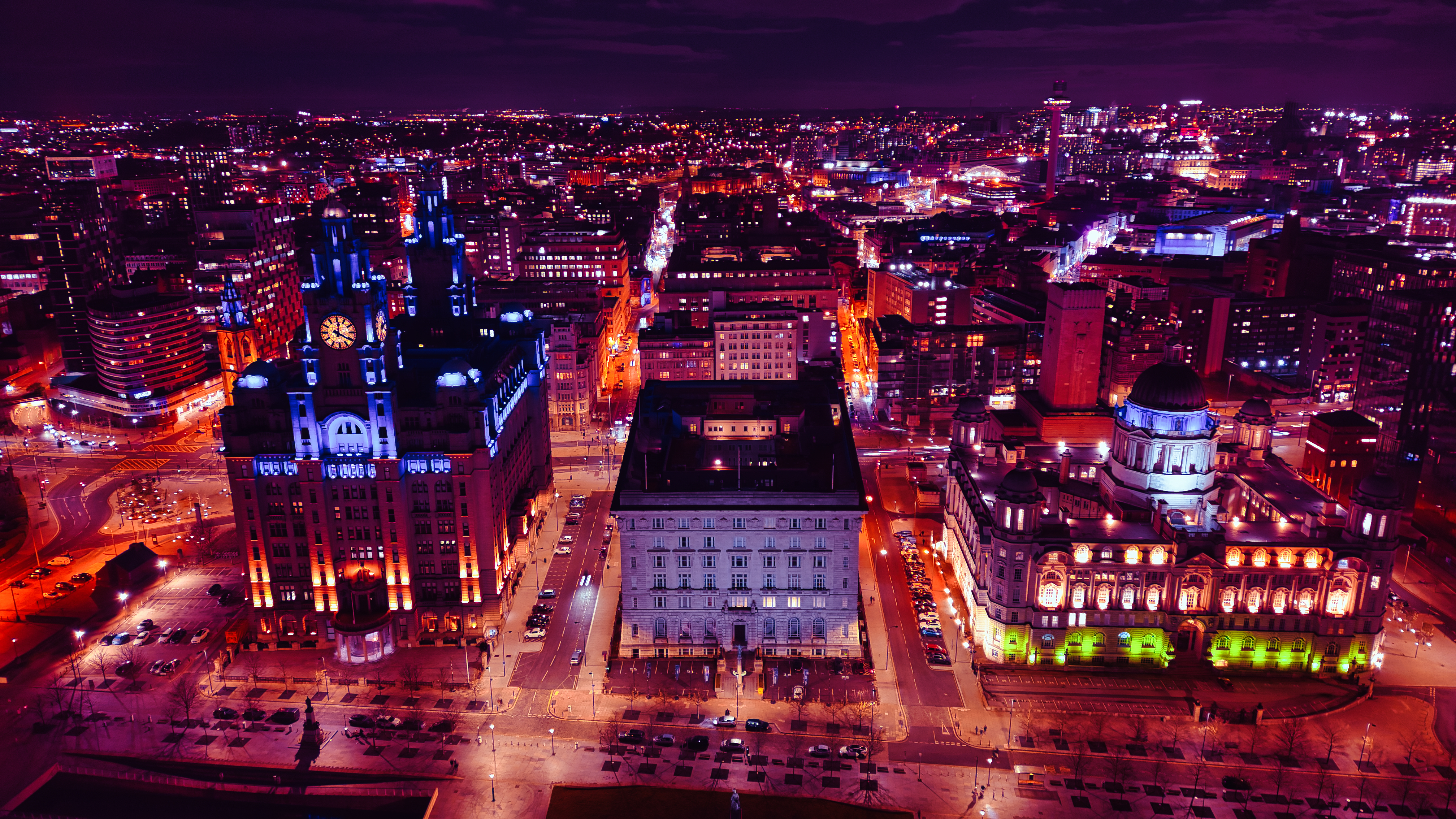 Aerial night view of a vibrant cityscape with illuminated buildings and streets in Liverpool, UK.