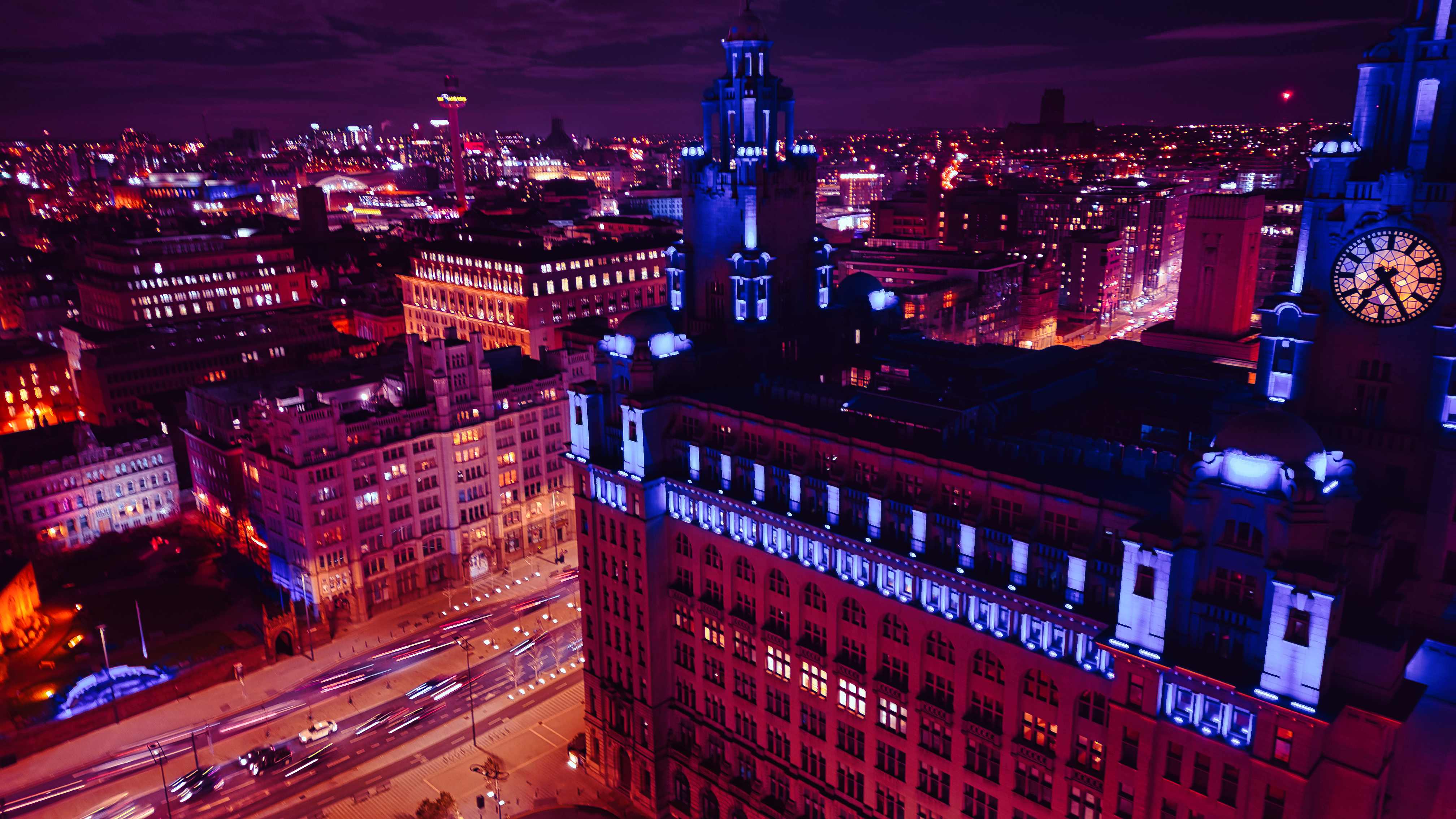 Aerial night view of a vibrant cityscape with illuminated buildings and streets in Liverpool, UK.