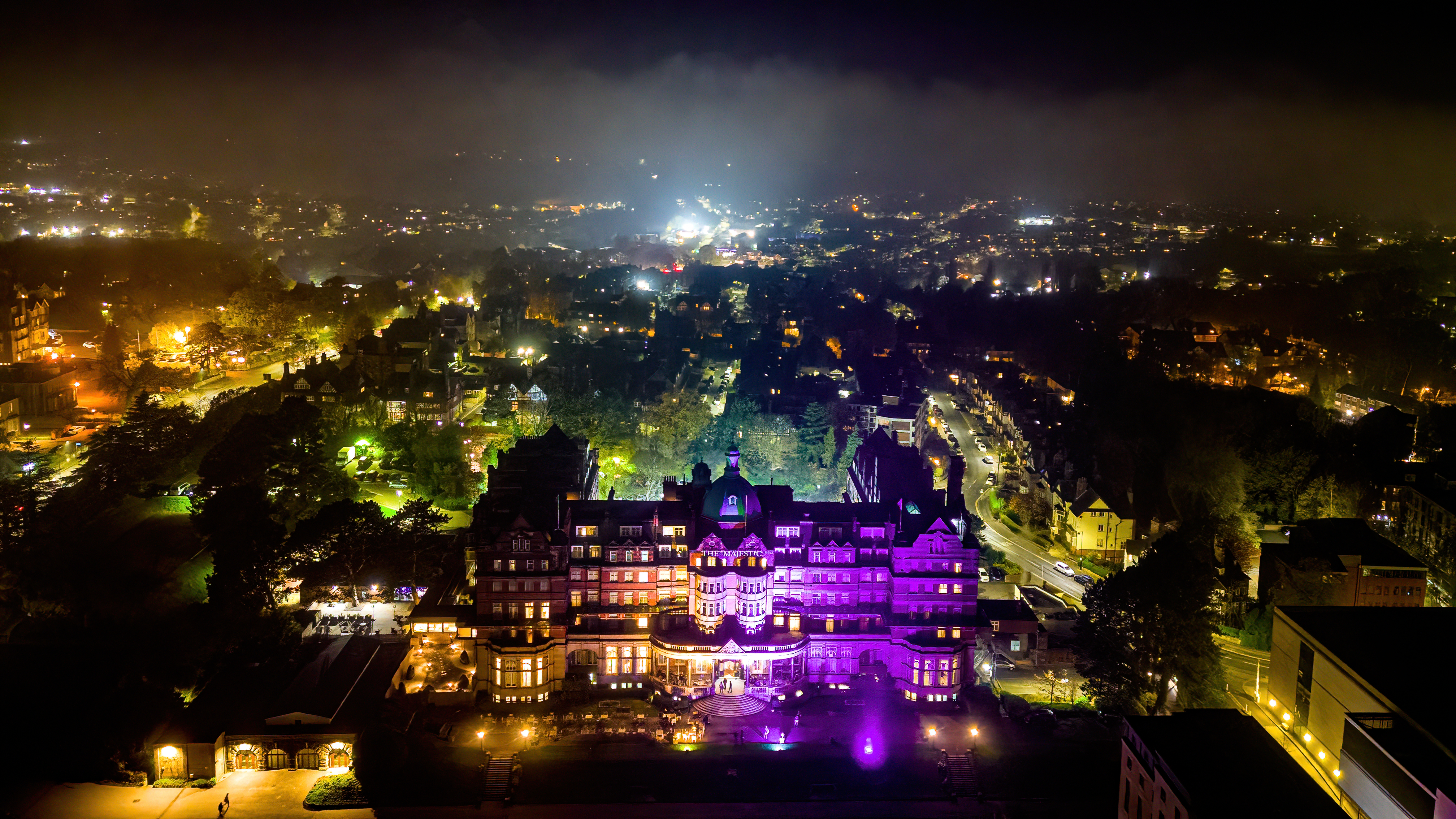 Aerial night view of a vibrant cityscape with illuminated buildings surrounded by trees in Harrogate, North Yorkshire.
