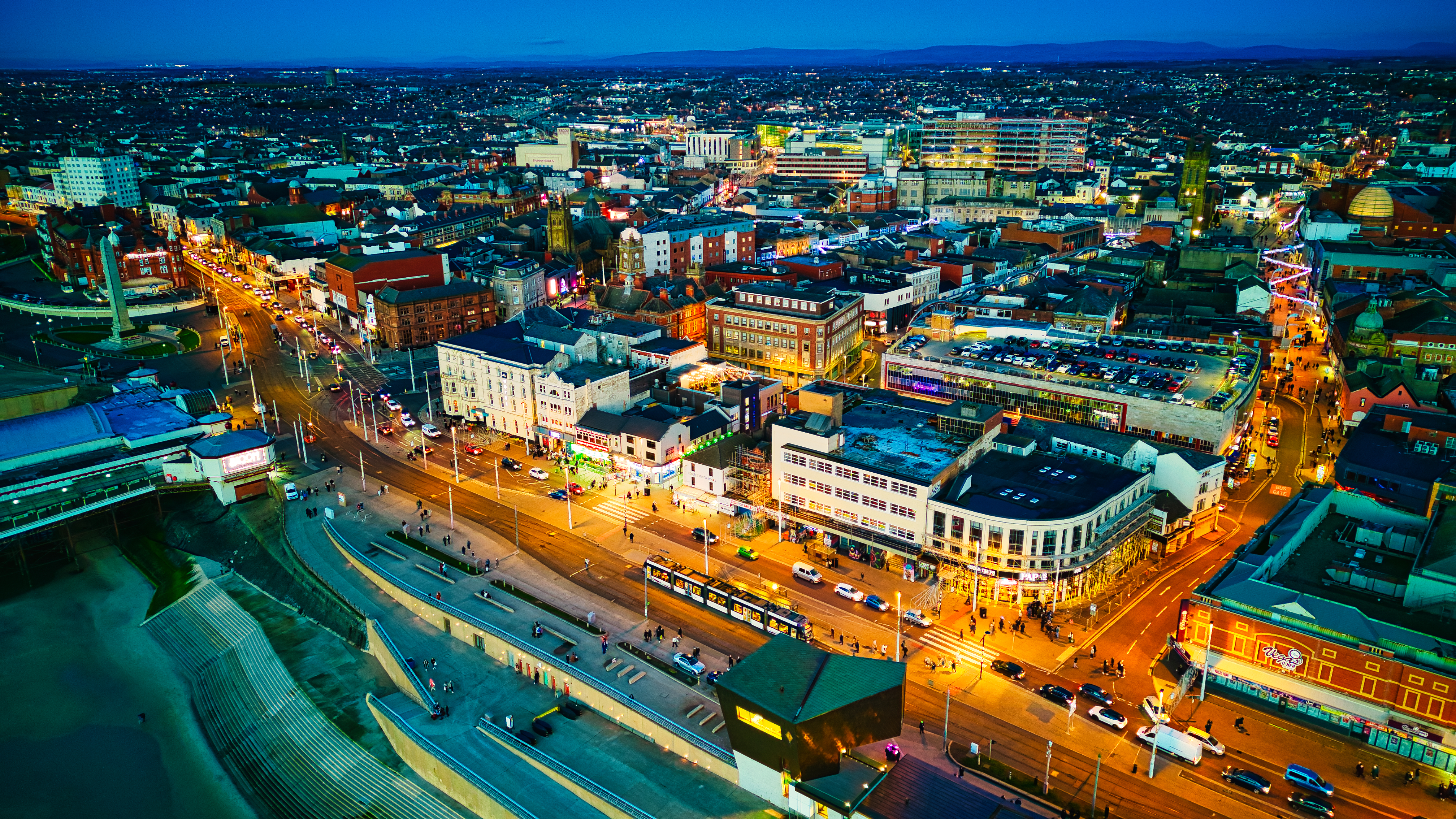 Aerial night view of a vibrant cityscape with illuminated streets and buildings, showcasing urban life and architecture in Backpool, England.