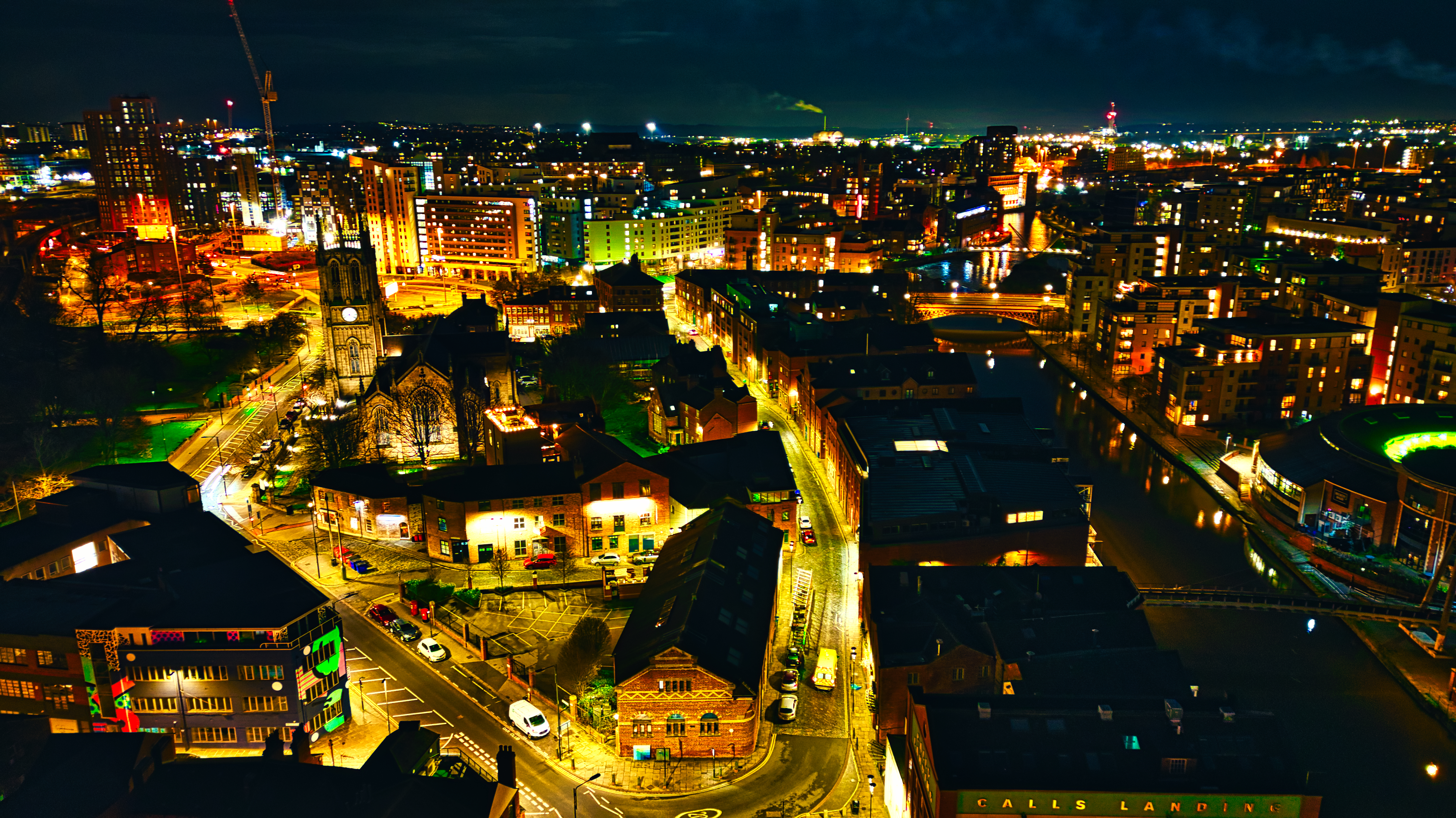 Aerial night view of a vibrant cityscape with illuminated streets and buildings in Leeds, UK.