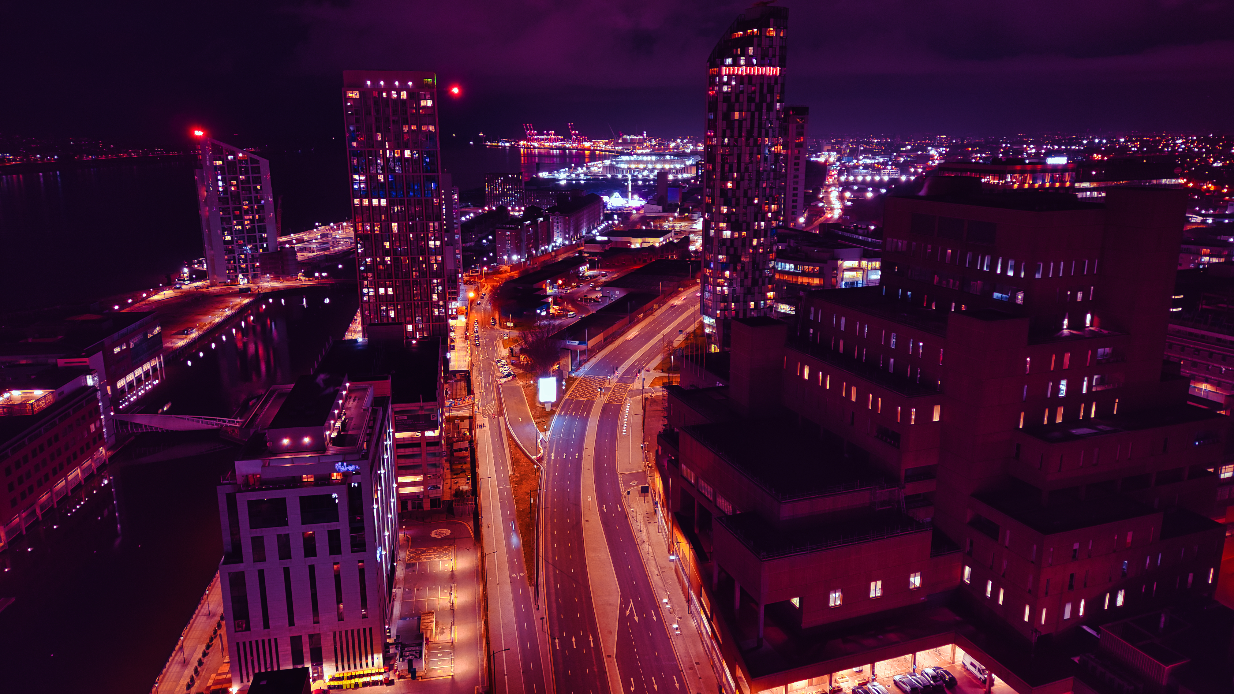 Aerial night view of a vibrant cityscape with illuminated streets and buildings in Liverpool, UK.