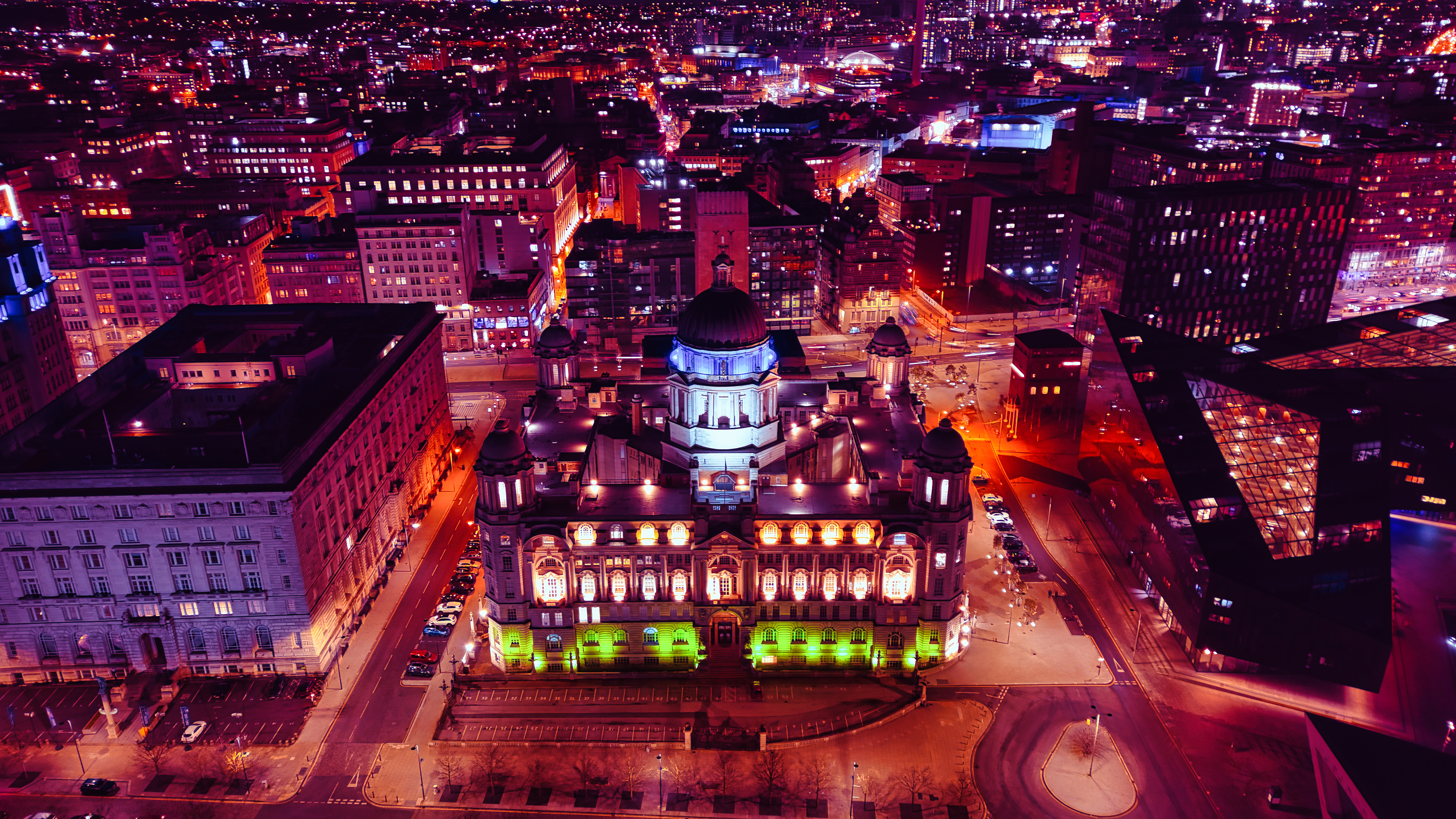 Aerial night view of an illuminated cityscape with historic architecture in Liverpool, UK.