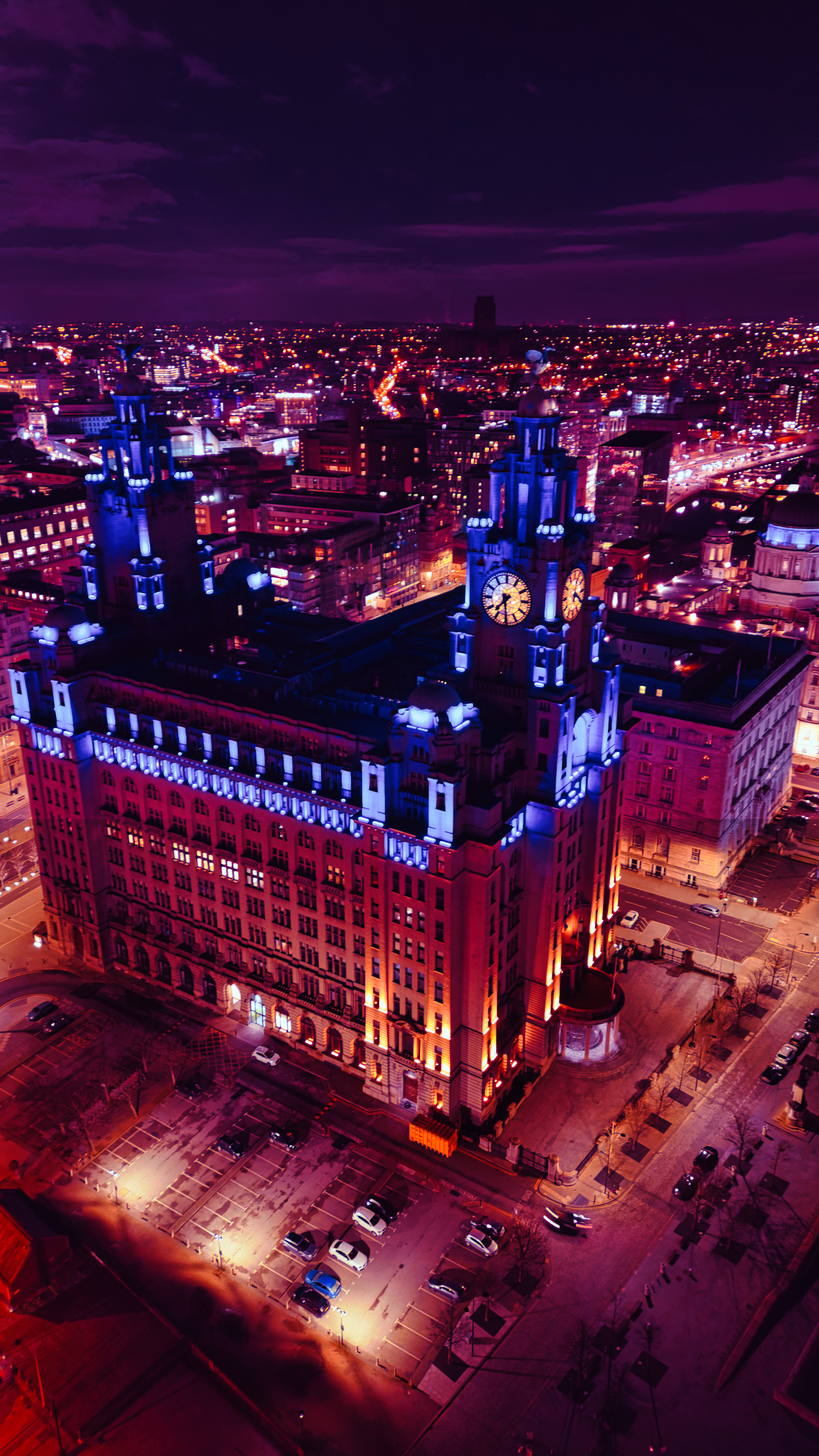 Aerial night view of an illuminated historic building in an urban cityscape with vibrant purple skies in Liverpool, UK.