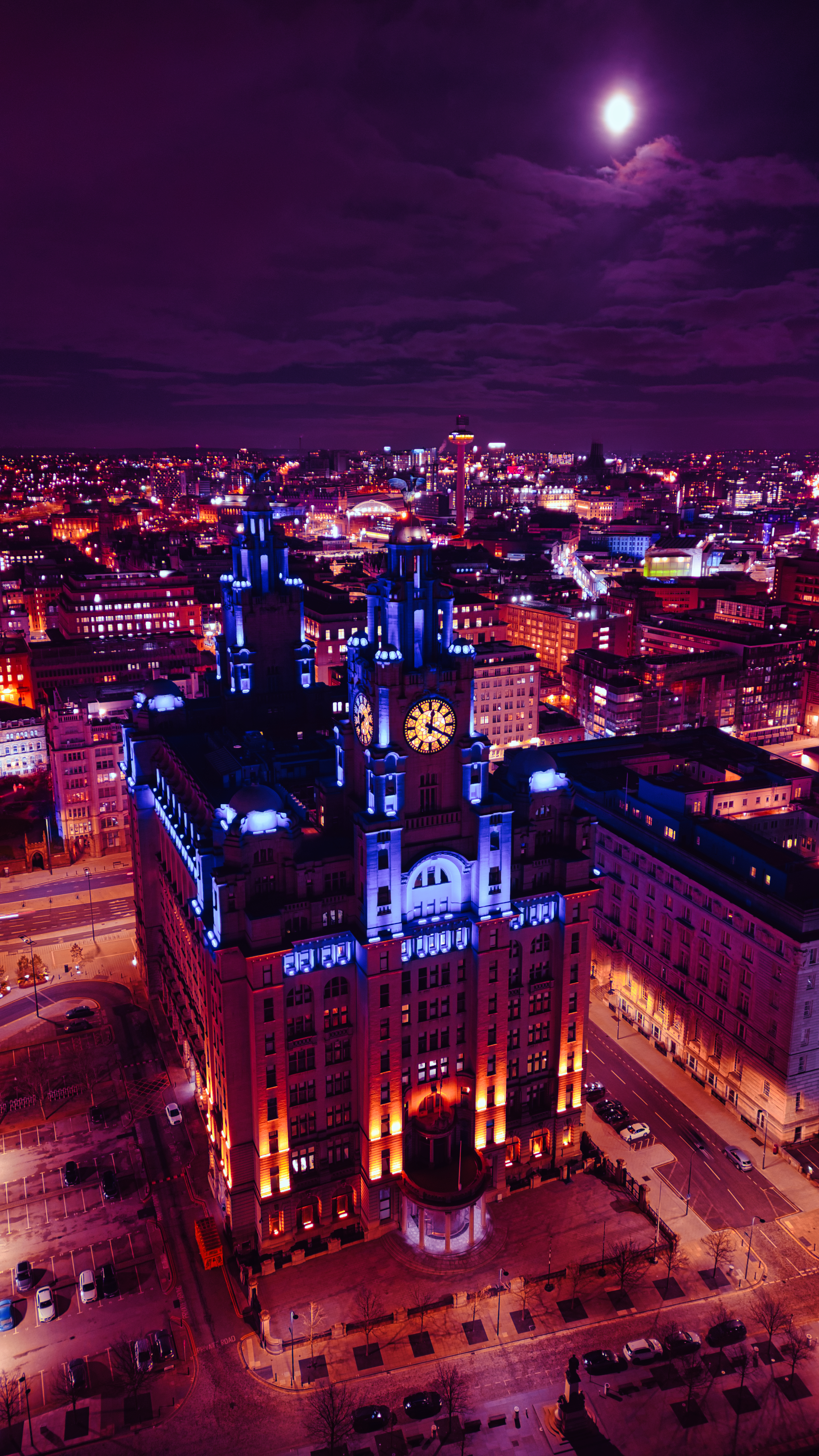 Aerial night view of an illuminated historic building in an urban cityscape with vibrant purple skies in Liverpool, UK.