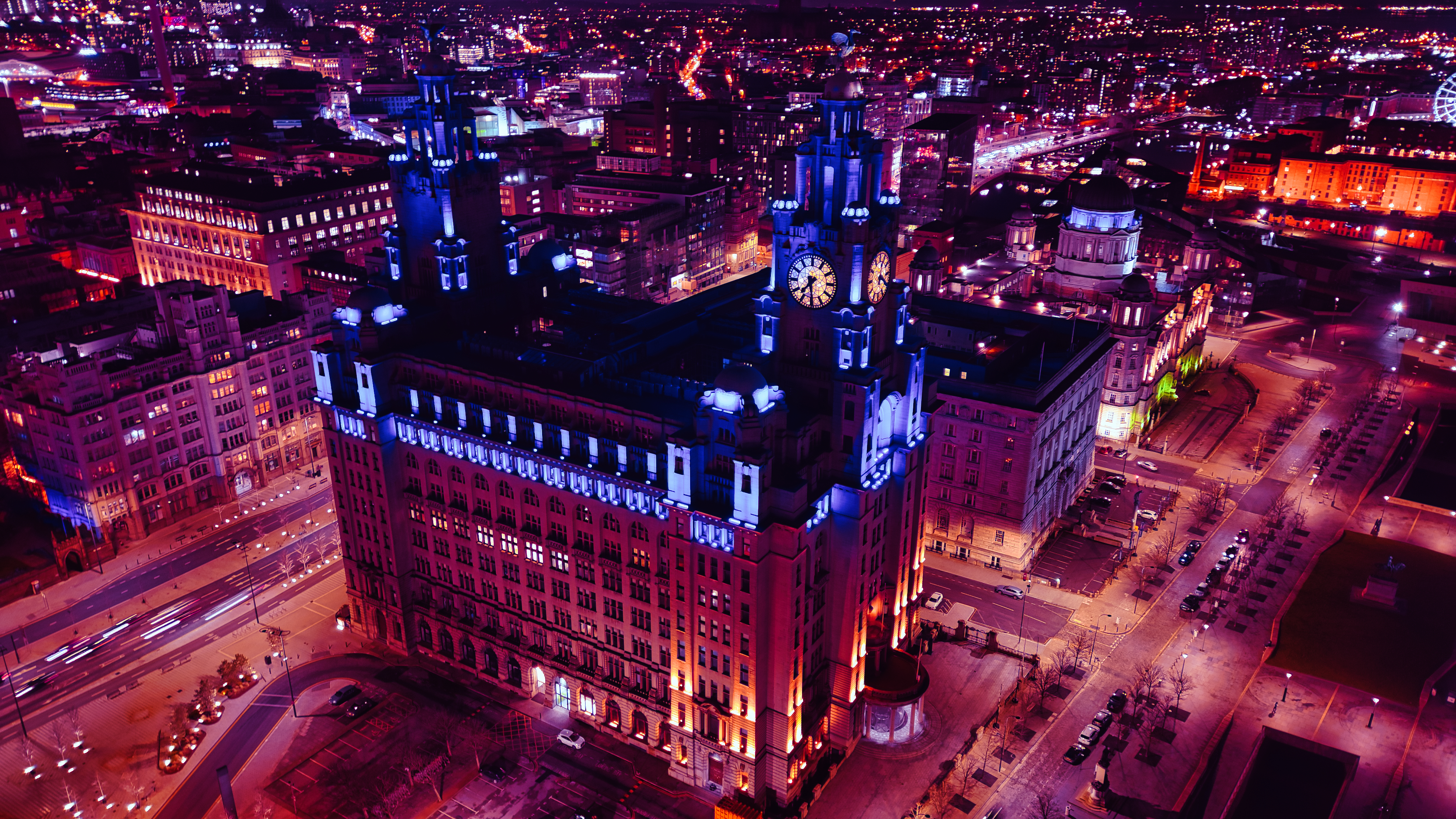 Aerial night view of an illuminated urban cityscape with historic architecture in Liverpool, UK.