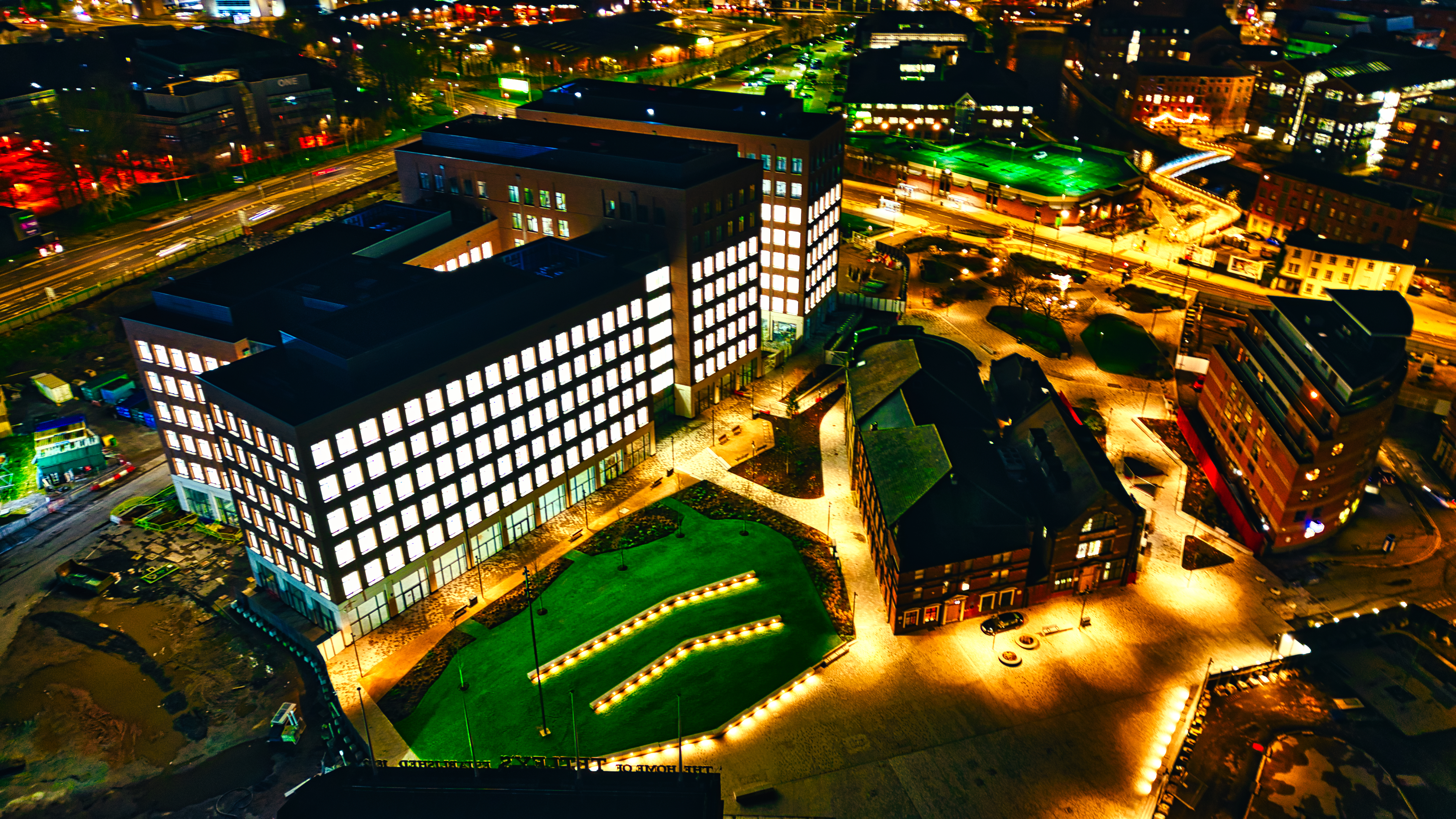 Aerial night view of illuminated modern buildings with surrounding streets and urban infrastructure in Leeds, UK.