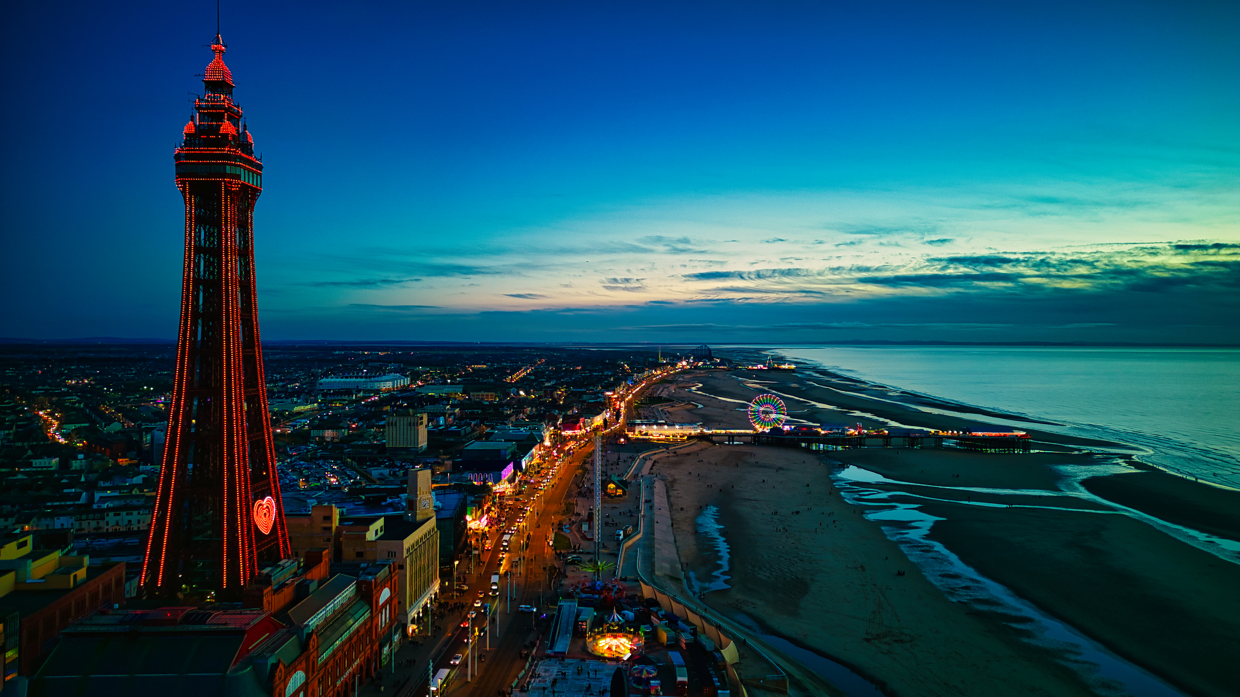Aerial twilight view of a lit tower beside a coastal road with a beach and ocean horizon in Backpool, England.