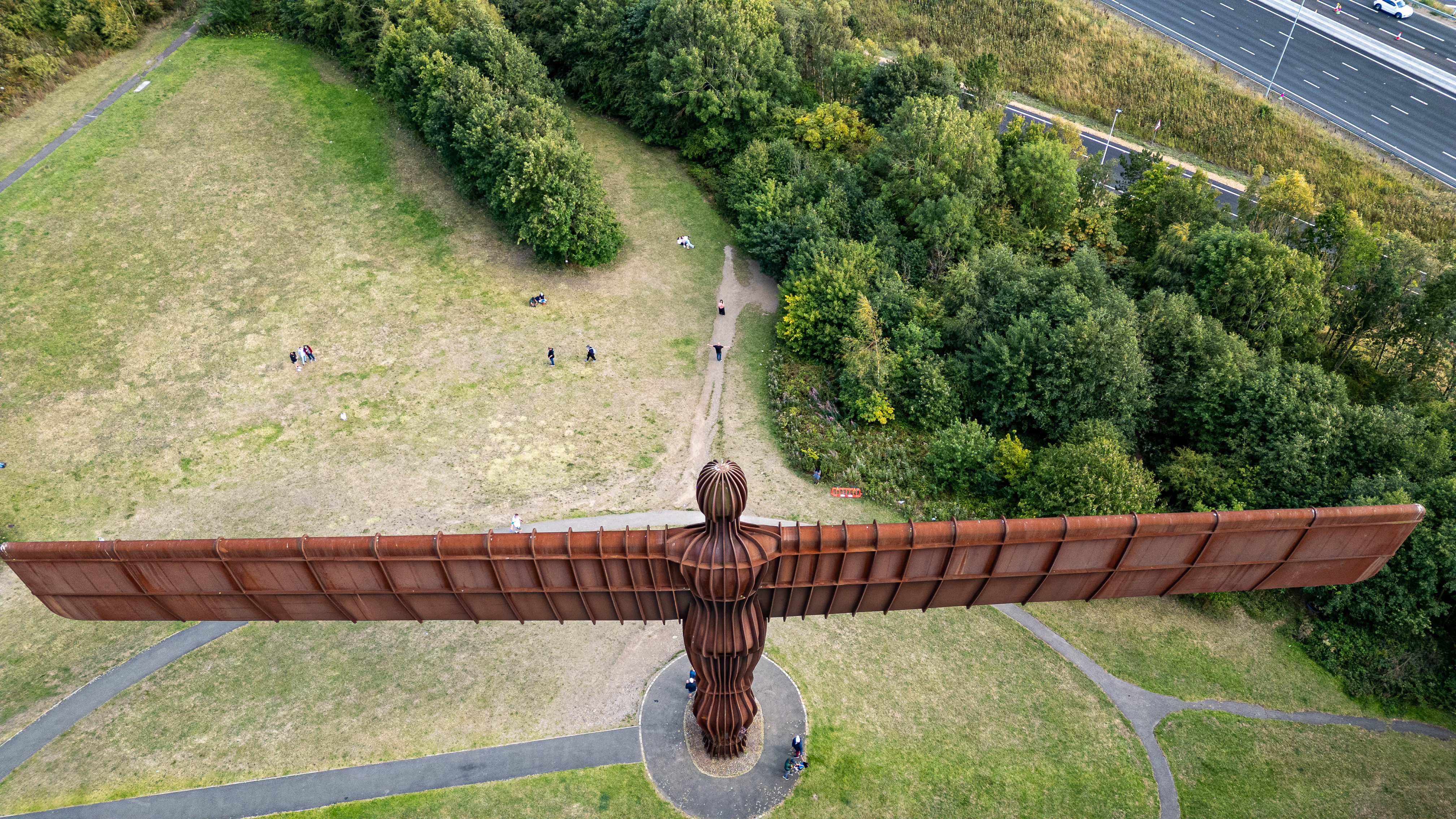 An aerial view of the Angel of the North sculpture made of rusted steel, with surrounding grassy areas, trees, a pathway, and a distant highway in Newcastle upon Tyne, UK.