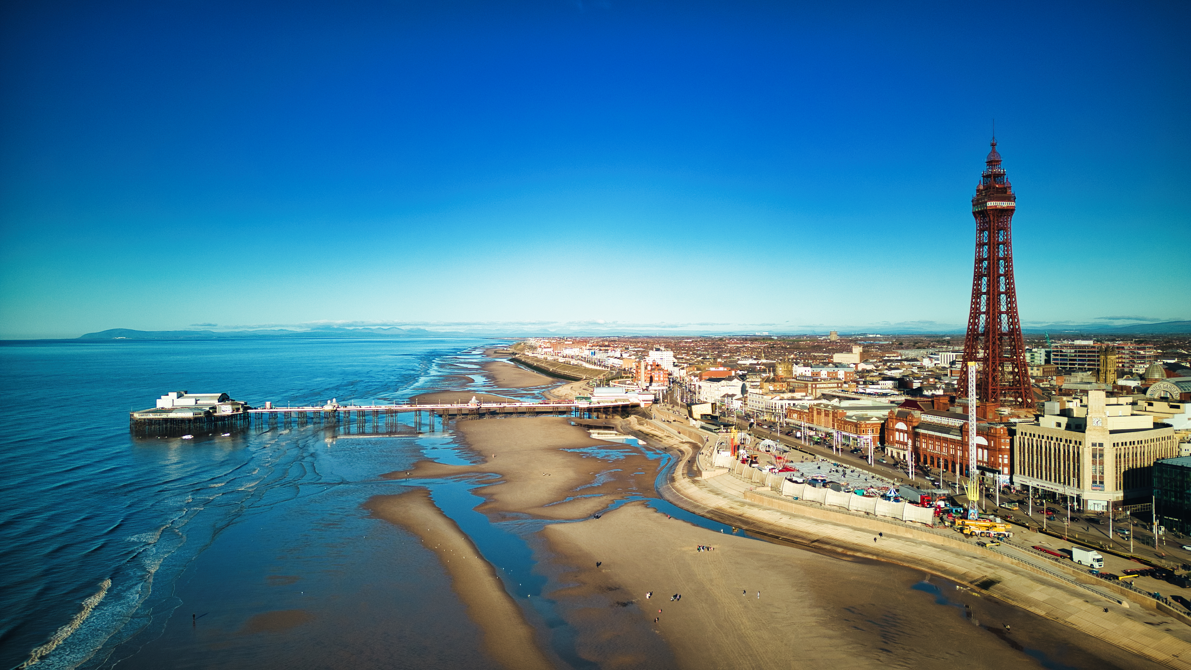Aerial view of Blackpool with the iconic tower, sandy beach, and promenade on a sunny day.