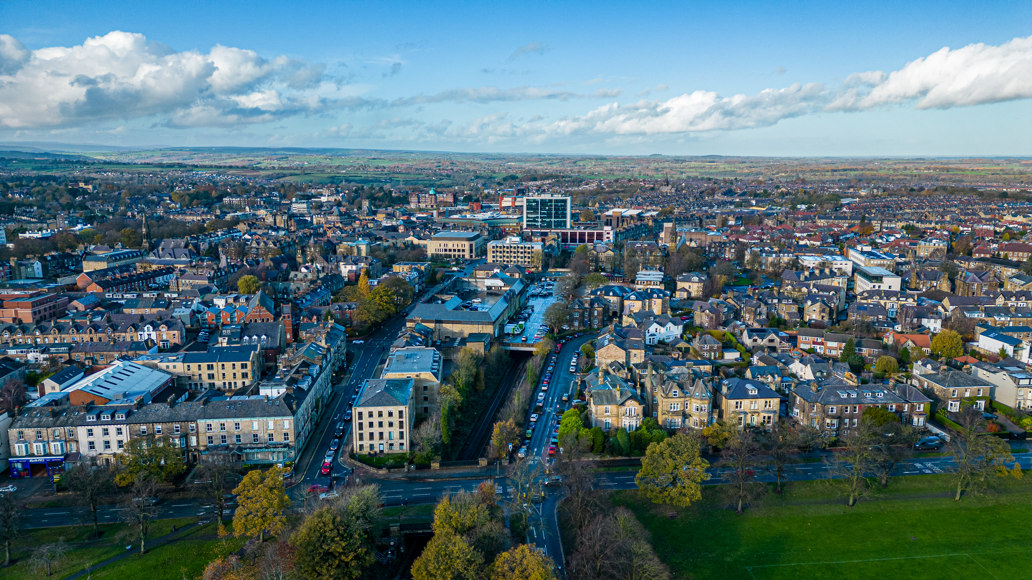 Aerial view of a European cityscape with historic buildings and modern structures under a cloudy sky in Harrogate, North Yorkshire.