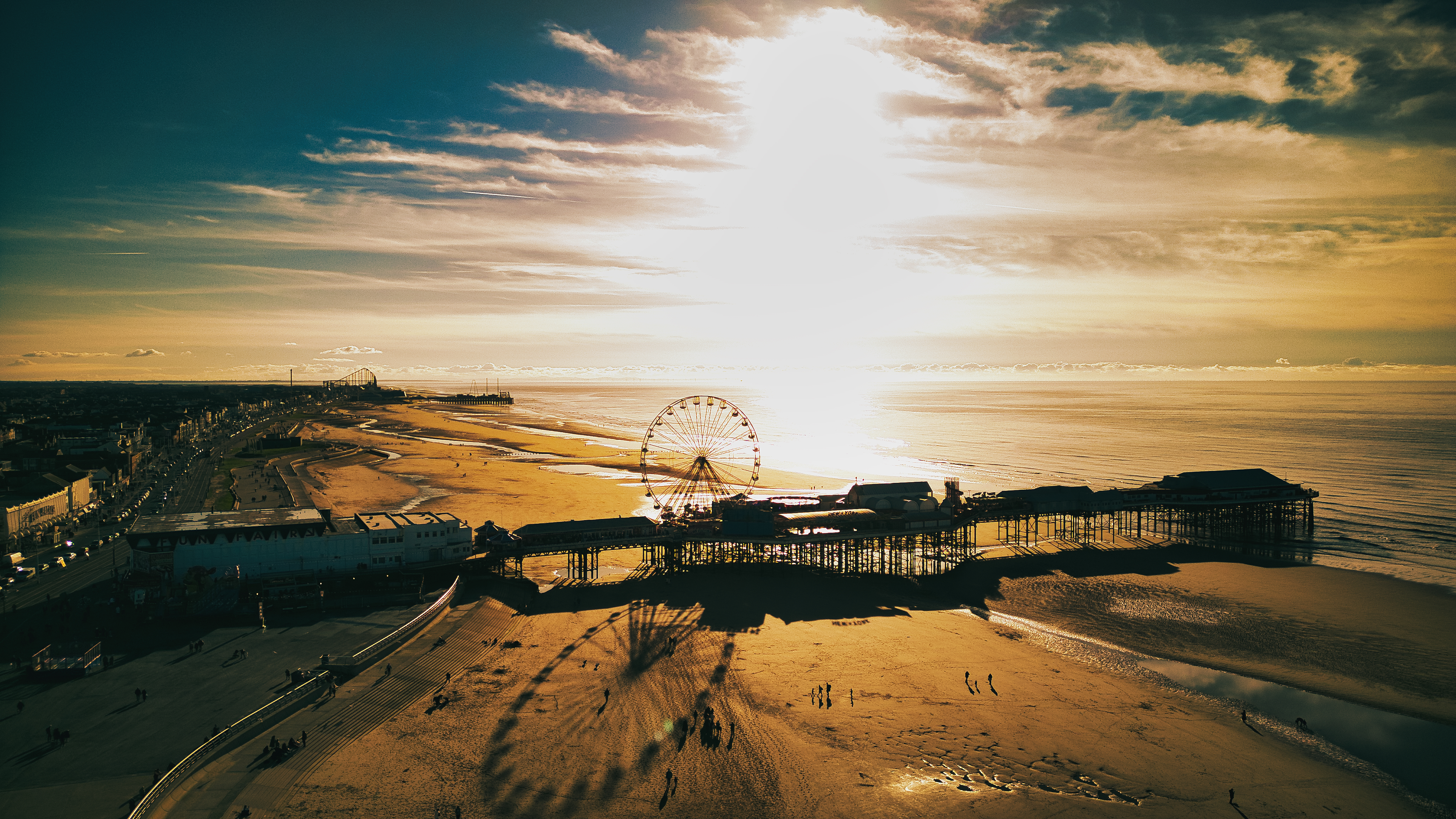 Aerial view of a beachfront with a pier and ferris wheel at sunset, casting long shadows in Backpool, England.