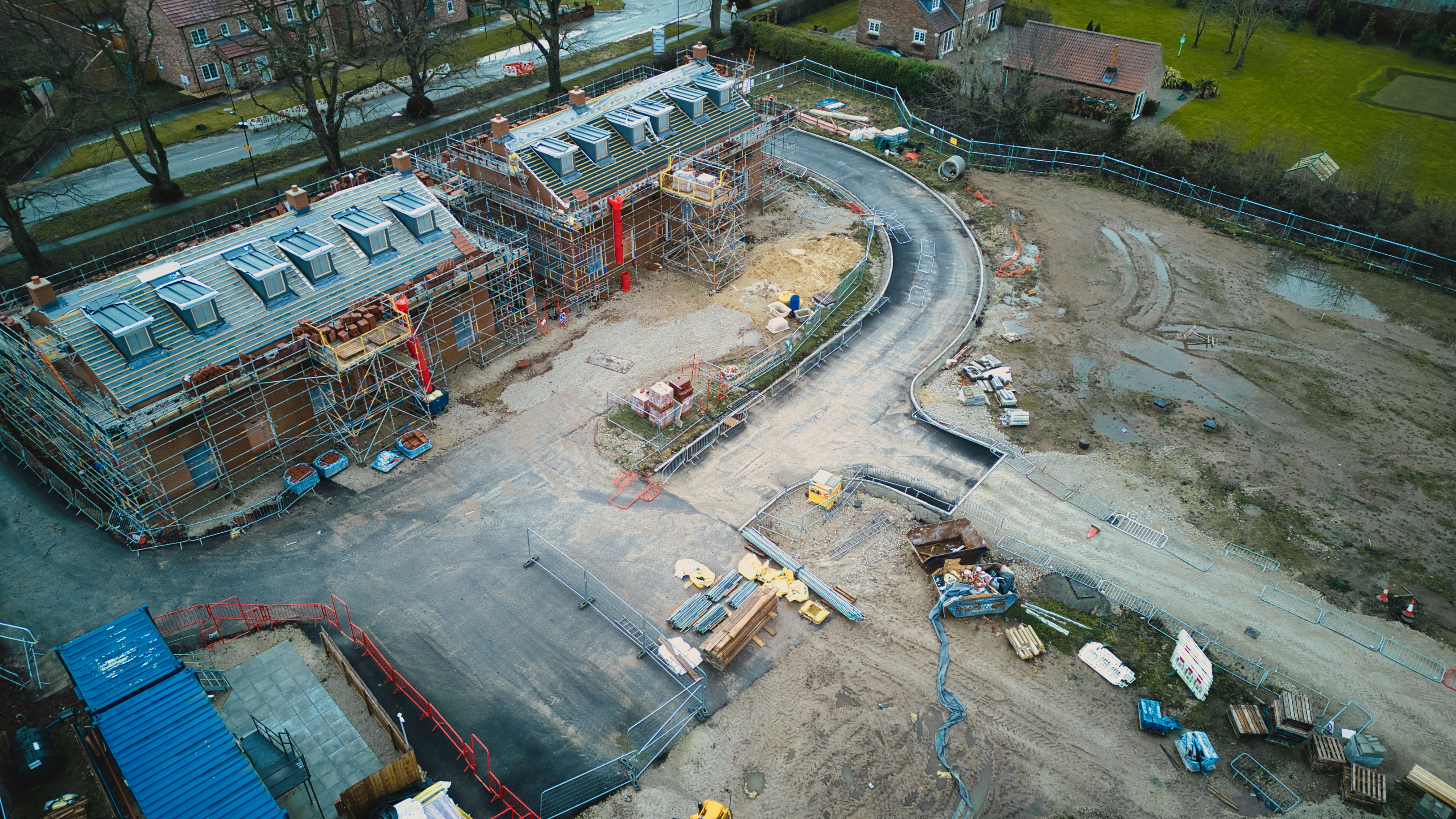 Aerial view of a residential construction site with unfinished houses and building materials, showcasing urban development.