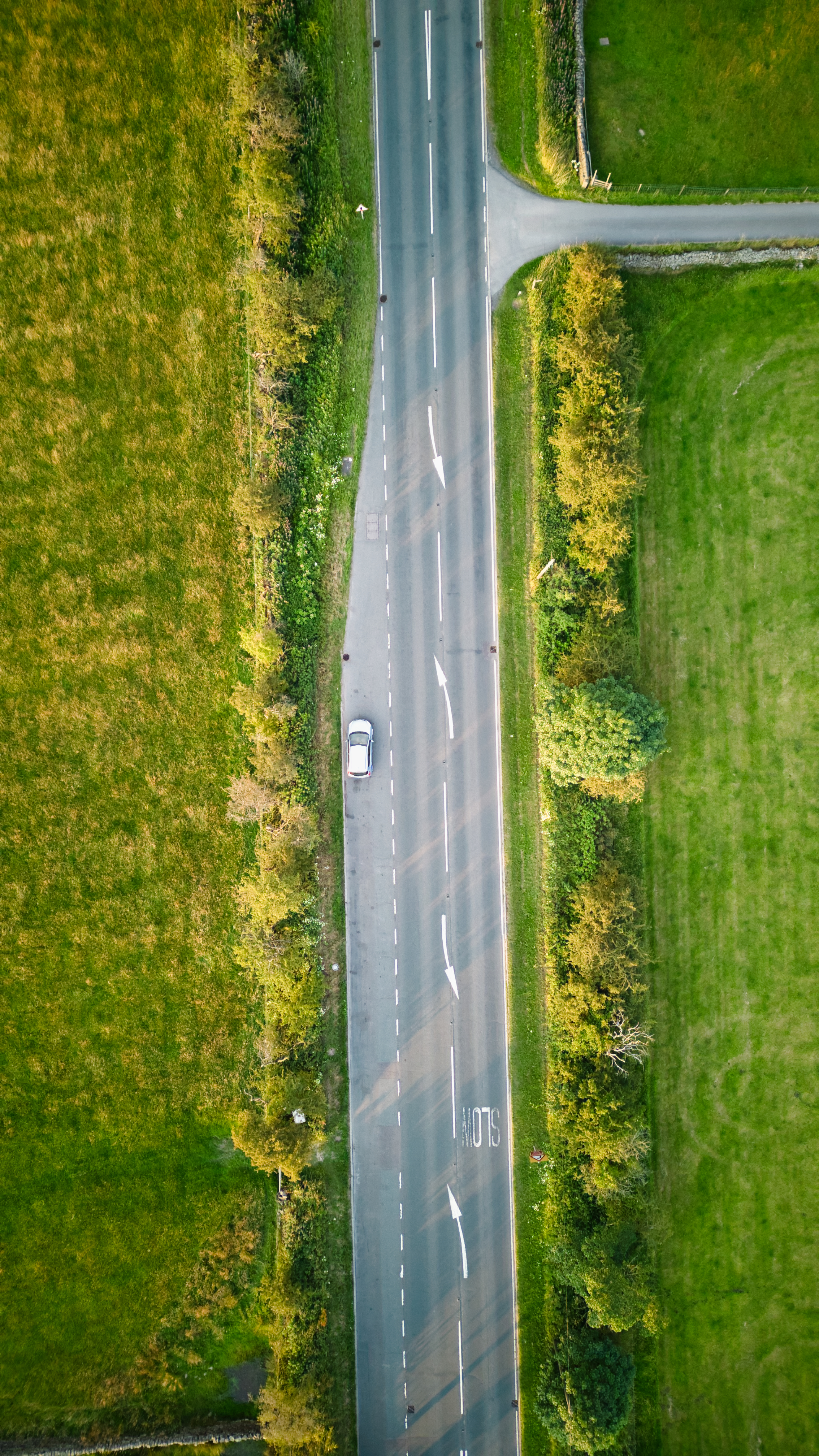 Aerial view of a car driving on a rural road with green fields on either side in Yorkshire.