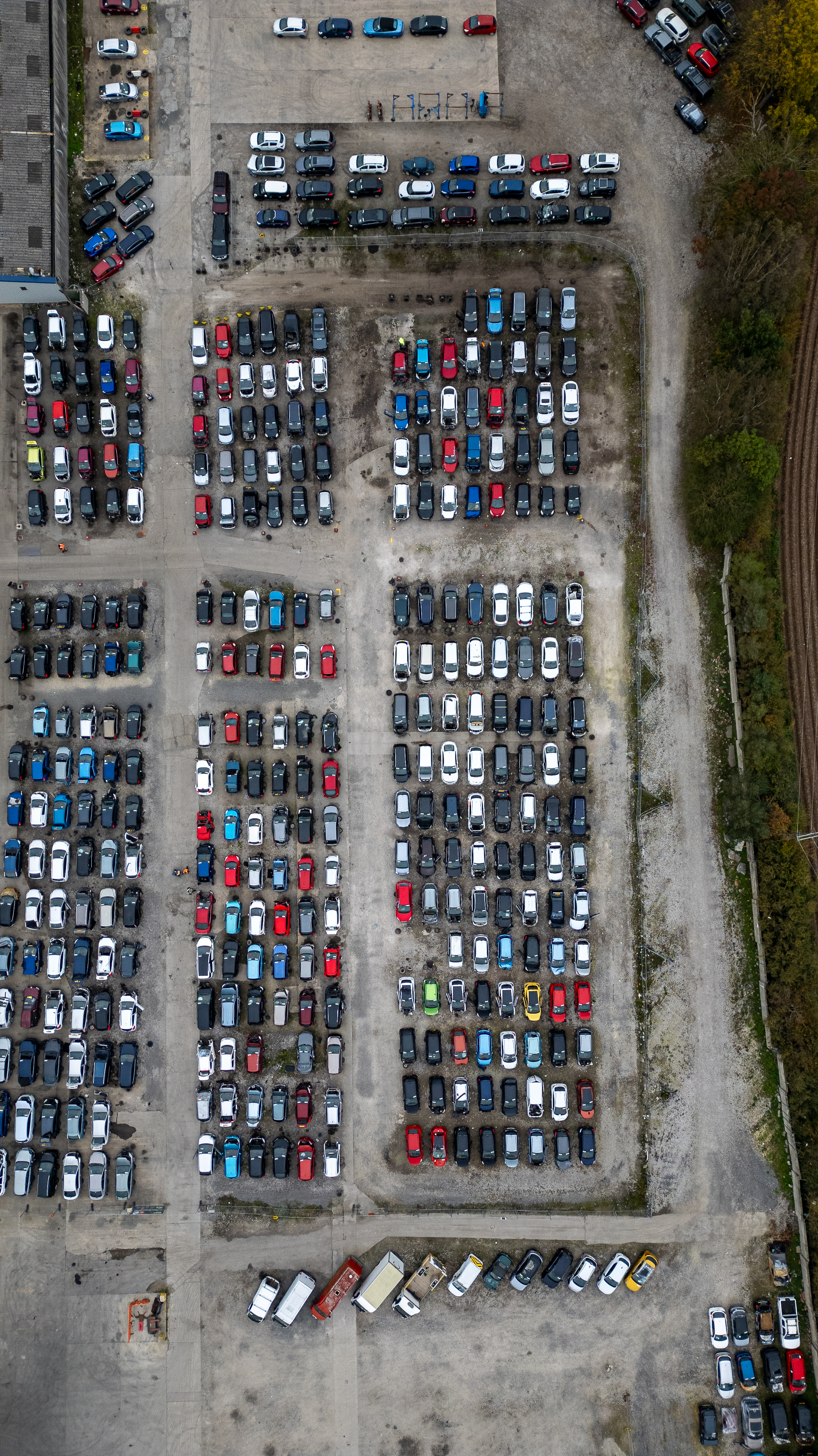 An aerial view of a large car lot, filled with rows of parked vehicles in various colors, mostly dark. A road runs alongside the lot, with trees and fields on the other side at U-Pull-It York, UK.