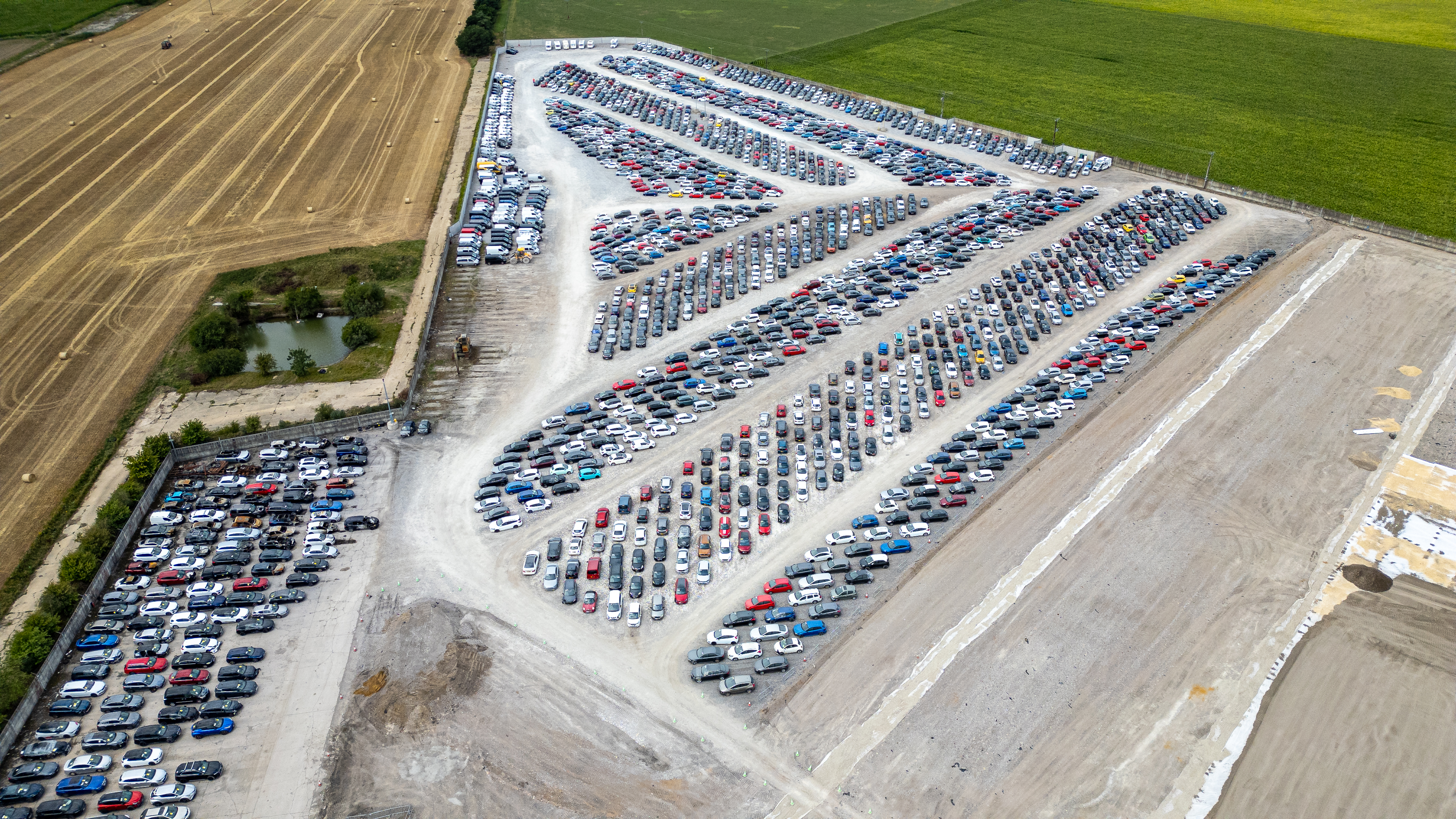 Aerial view of a vast car storage lot with vehicles parked in rows next to agricultural fields and a small pond at Copart yard in York, UK.
