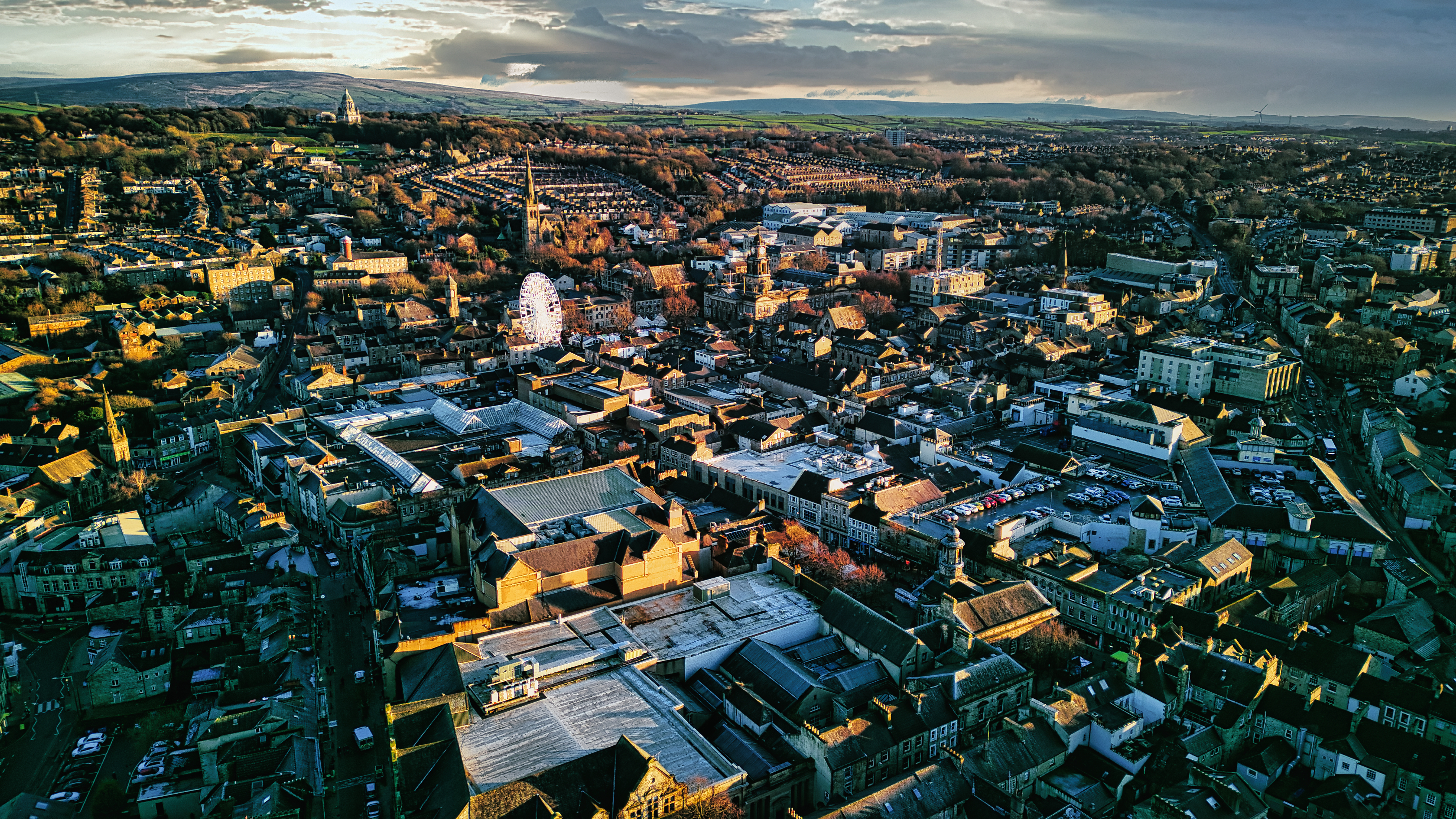 Aerial view of a city Lancaster at sunset with warm lighting highlighting the buildings and streets, showcasing the urban landscape.
