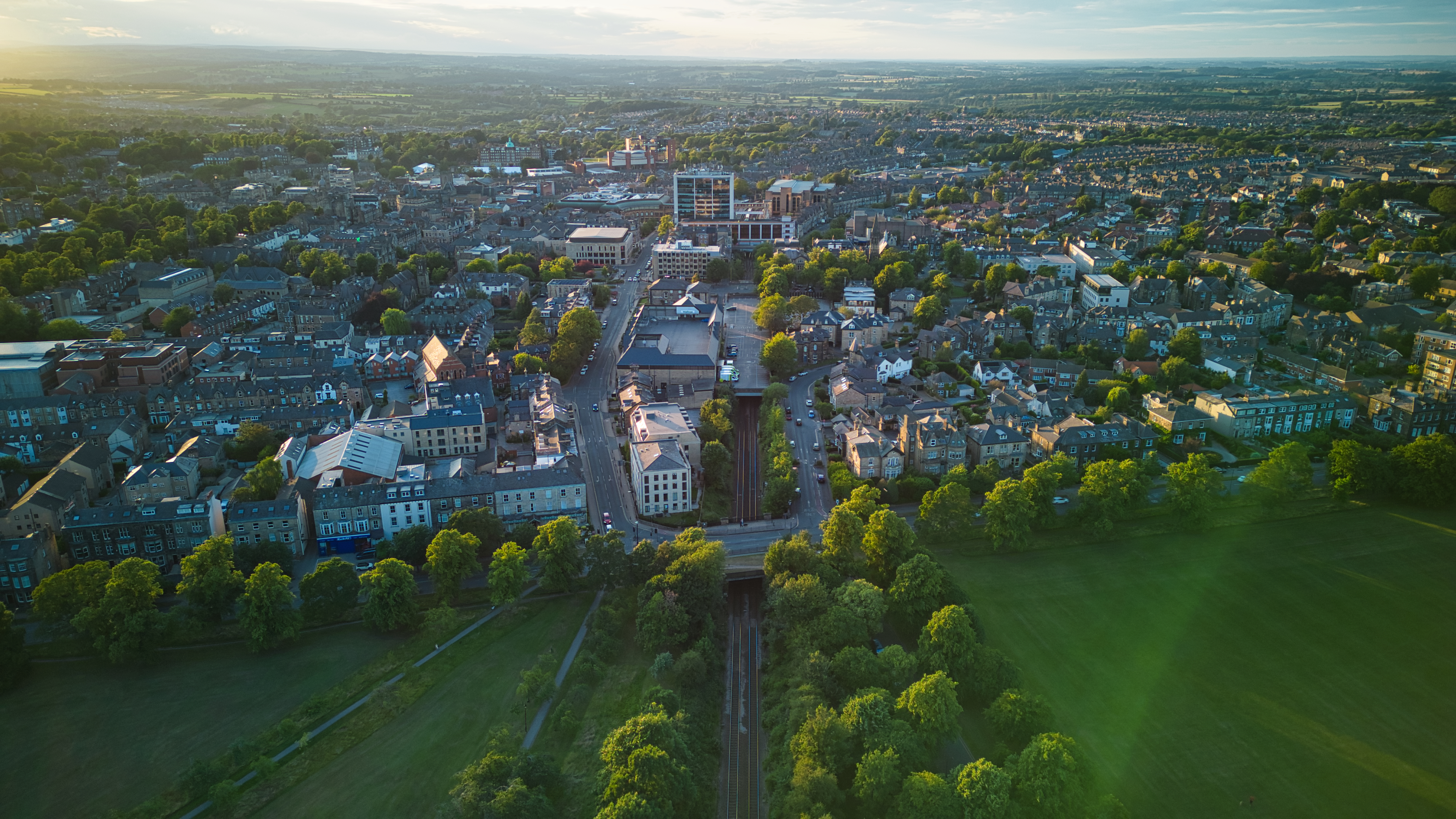 Aerial view of a city at sunset with warm lighting, showcasing urban architecture and green spaces in Harrogate, North Yorkshire.