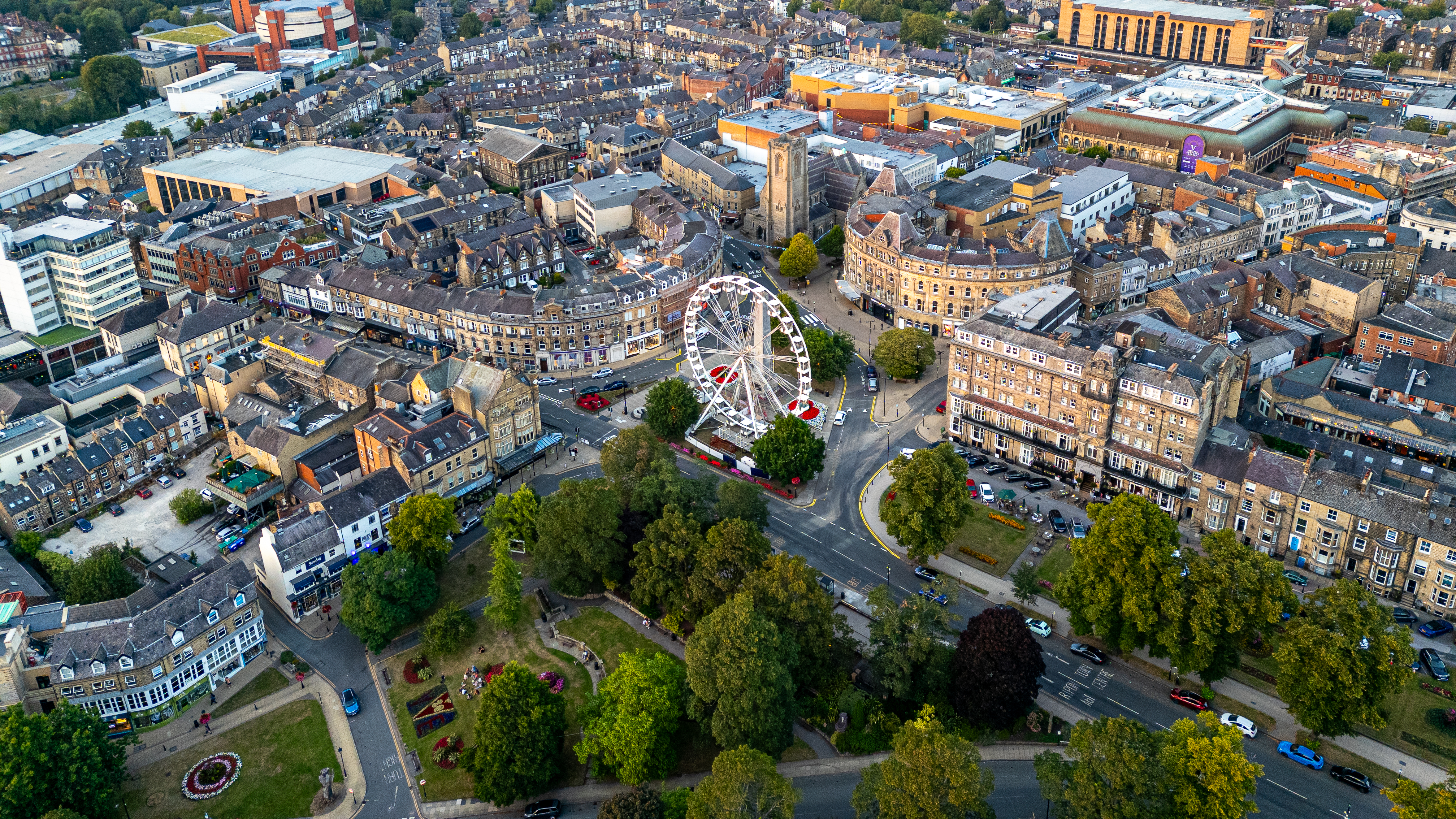 Aerial view of a city center with a Ferris wheel, park, and diverse architecture under a warm, overcast sky in Harrogate, UK.