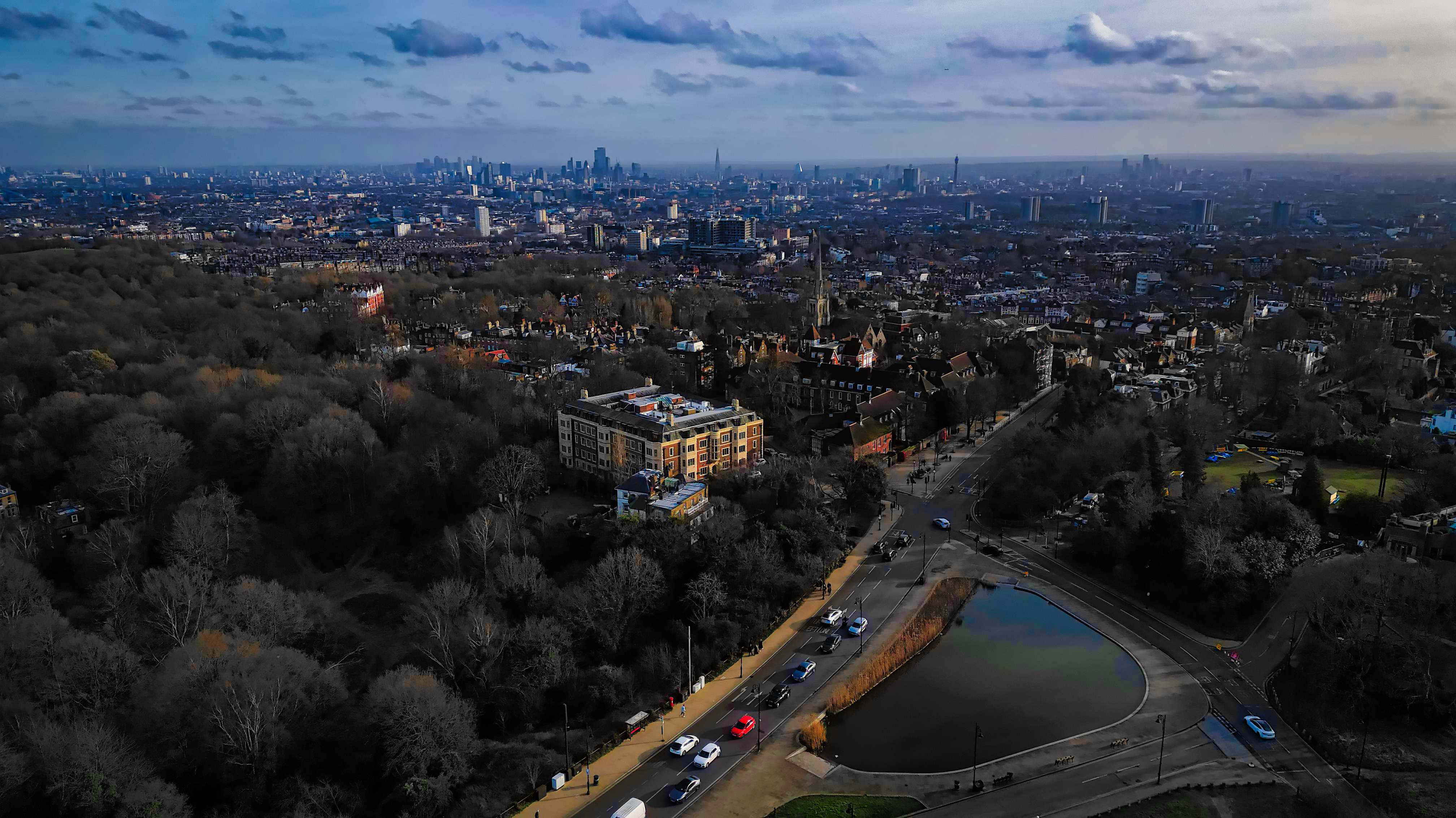Aerial view of a city skyline at dusk with urban park, water bodies, and scattered clouds.