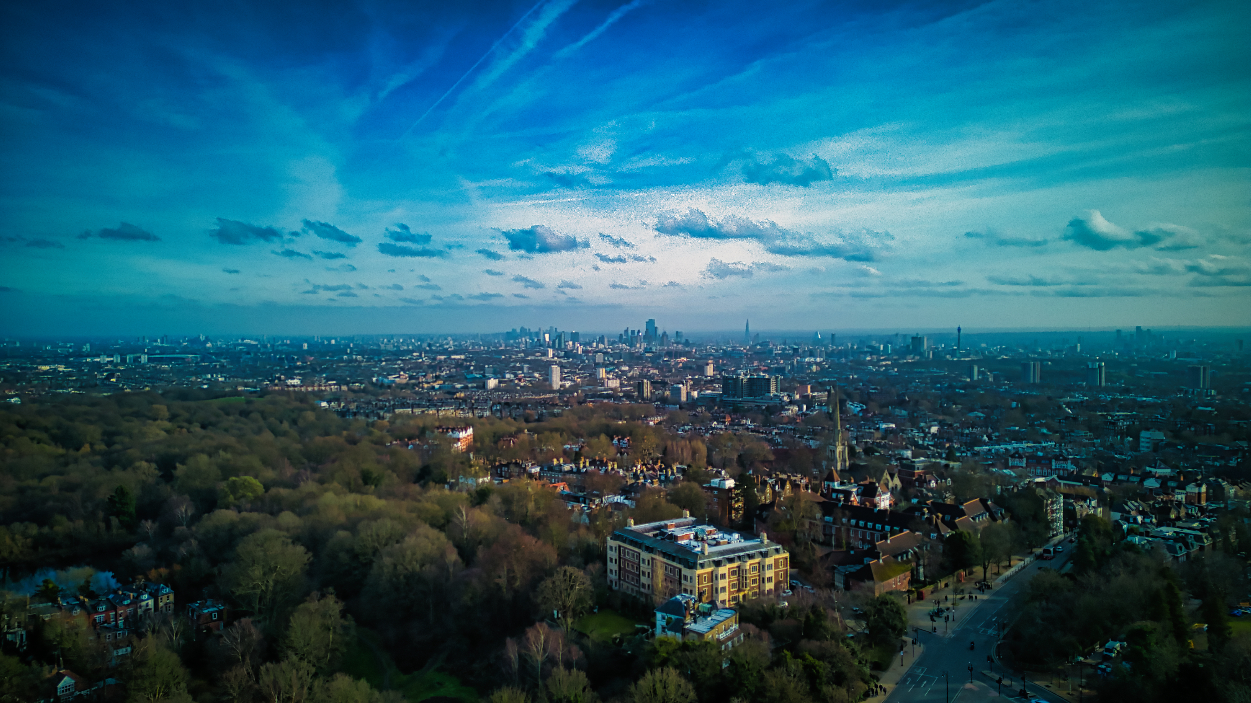 Aerial view of a city skyline with lush greenery under a vibrant blue sky with wispy clouds.