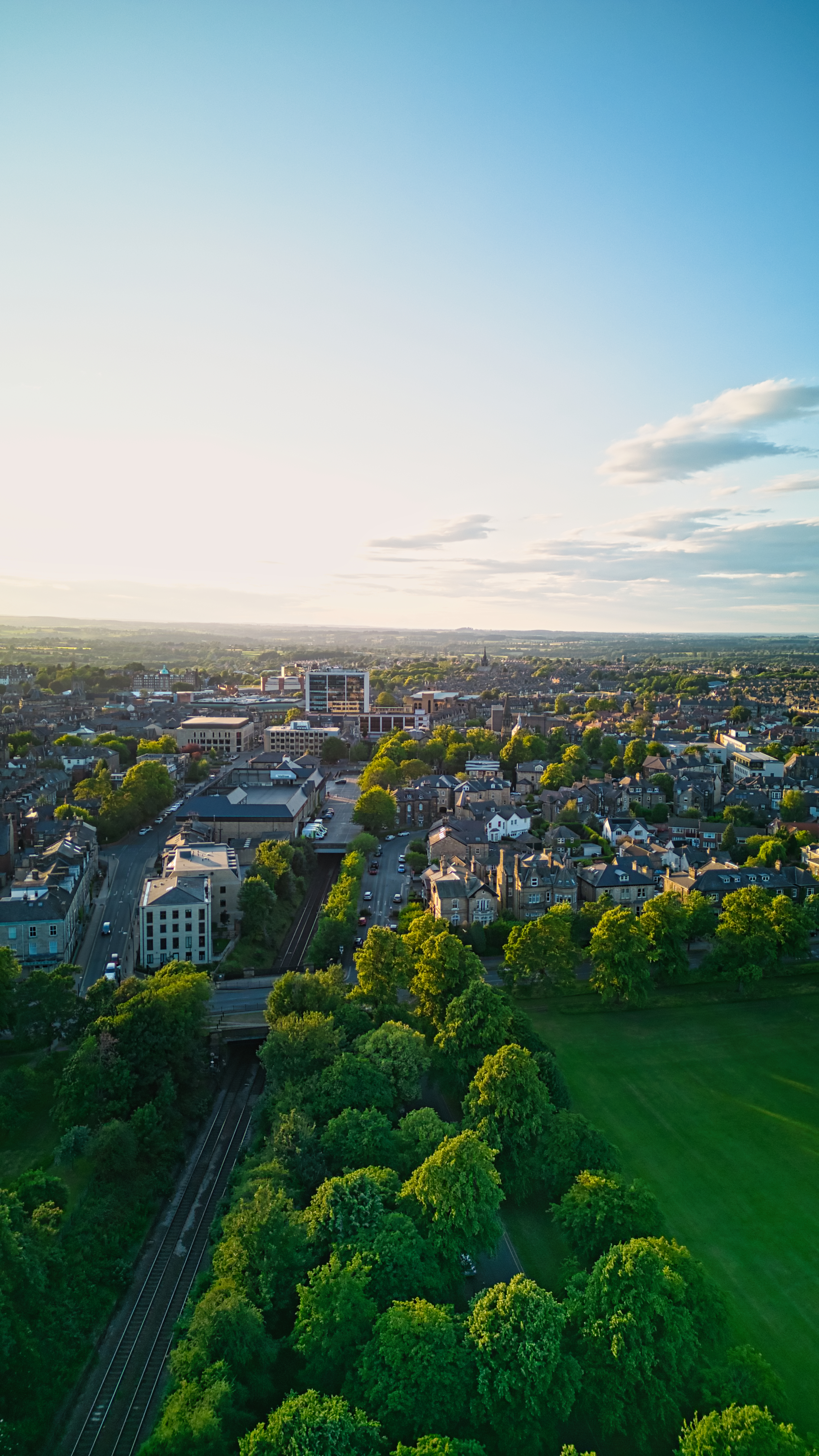Aerial view of a cityscape at sunset with lush greenery and clear skies in Harrogate, North Yorkshire.