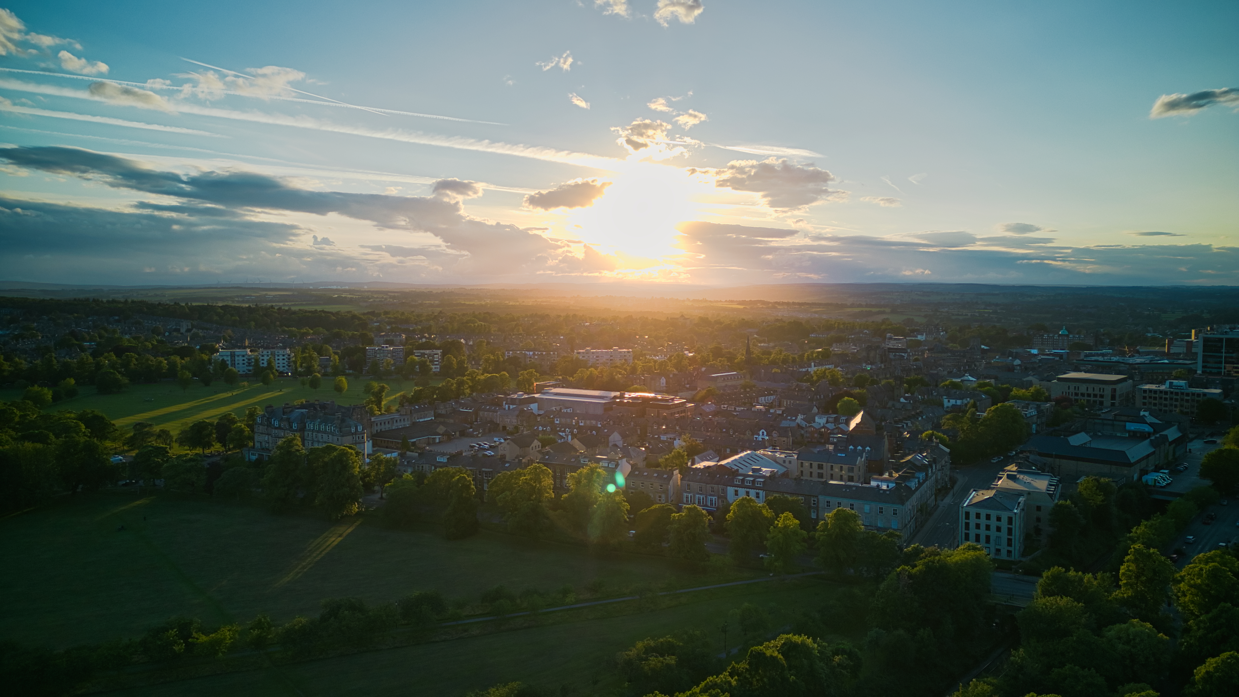Aerial view of a cityscape at sunset with sun rays piercing through clouds, highlighting green spaces and urban buildings in Harrogate, North Yorkshire.