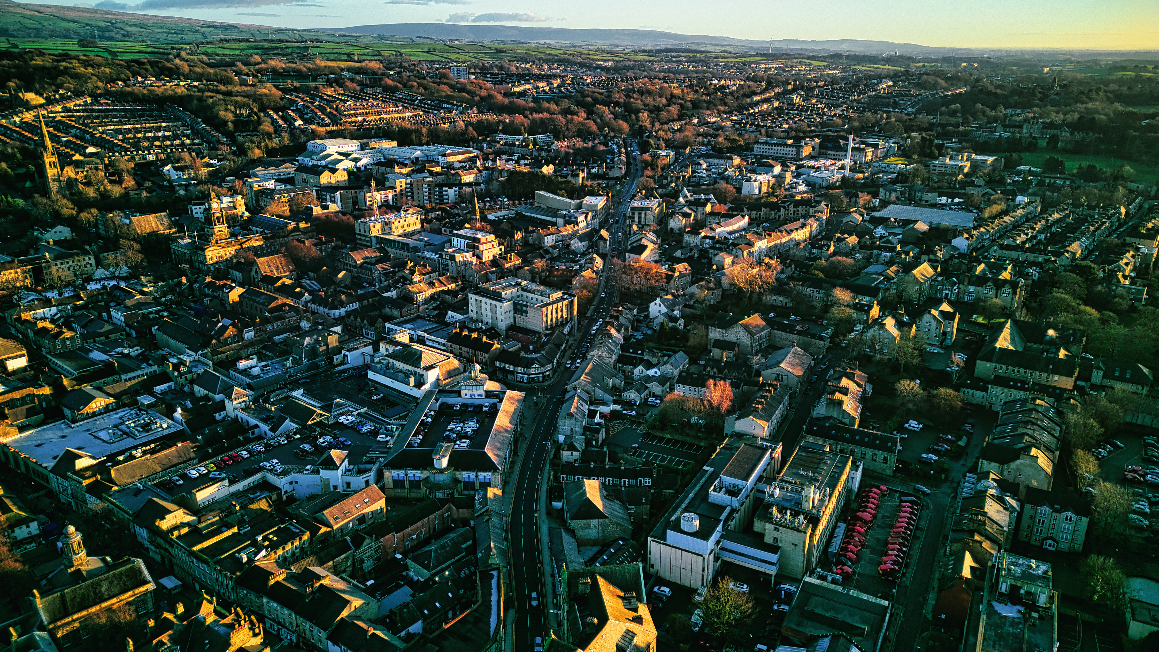 Aerial view of a cityscape at sunset with warm lighting, showcasing dense buildings and streets leading to the horizon in Lancaster.