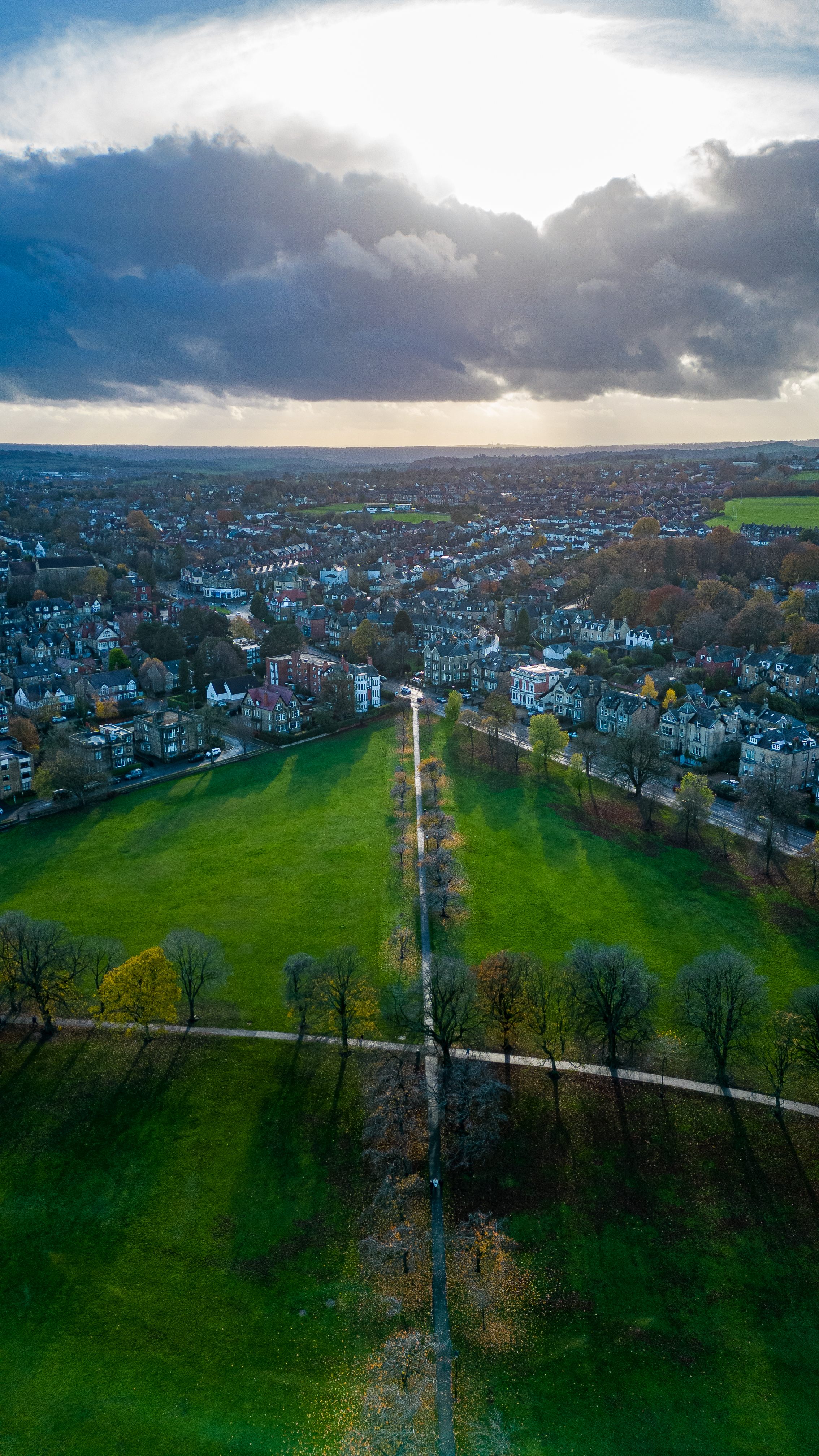 Aerial view of a cityscape with a road leading through green fields under a dramatic cloudy sky in Harrogate, North Yorkshire.