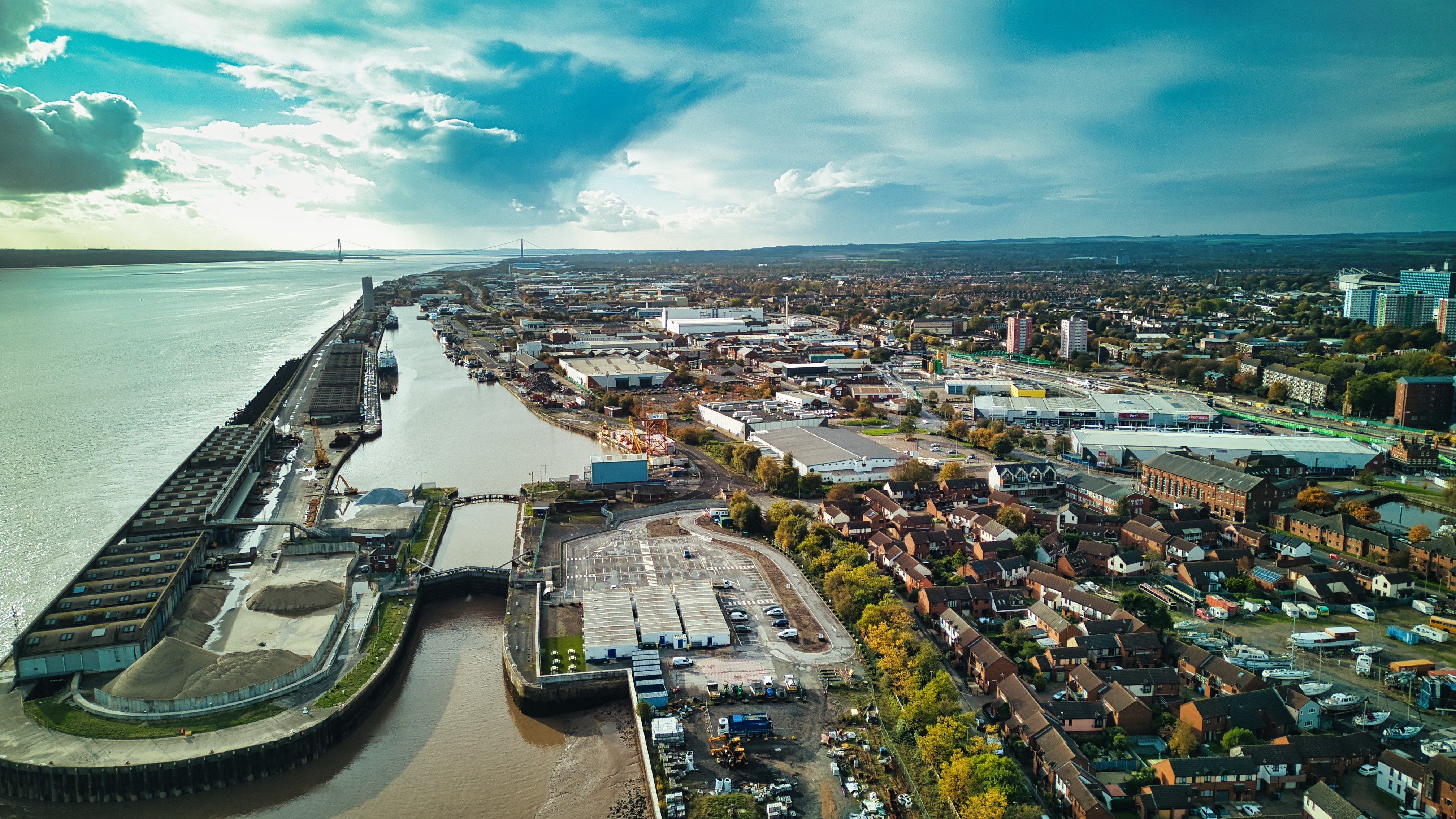 Aerial view of a coastal cityscape with urban architecture, docks, and a river under a cloudy sky in Hull, England.