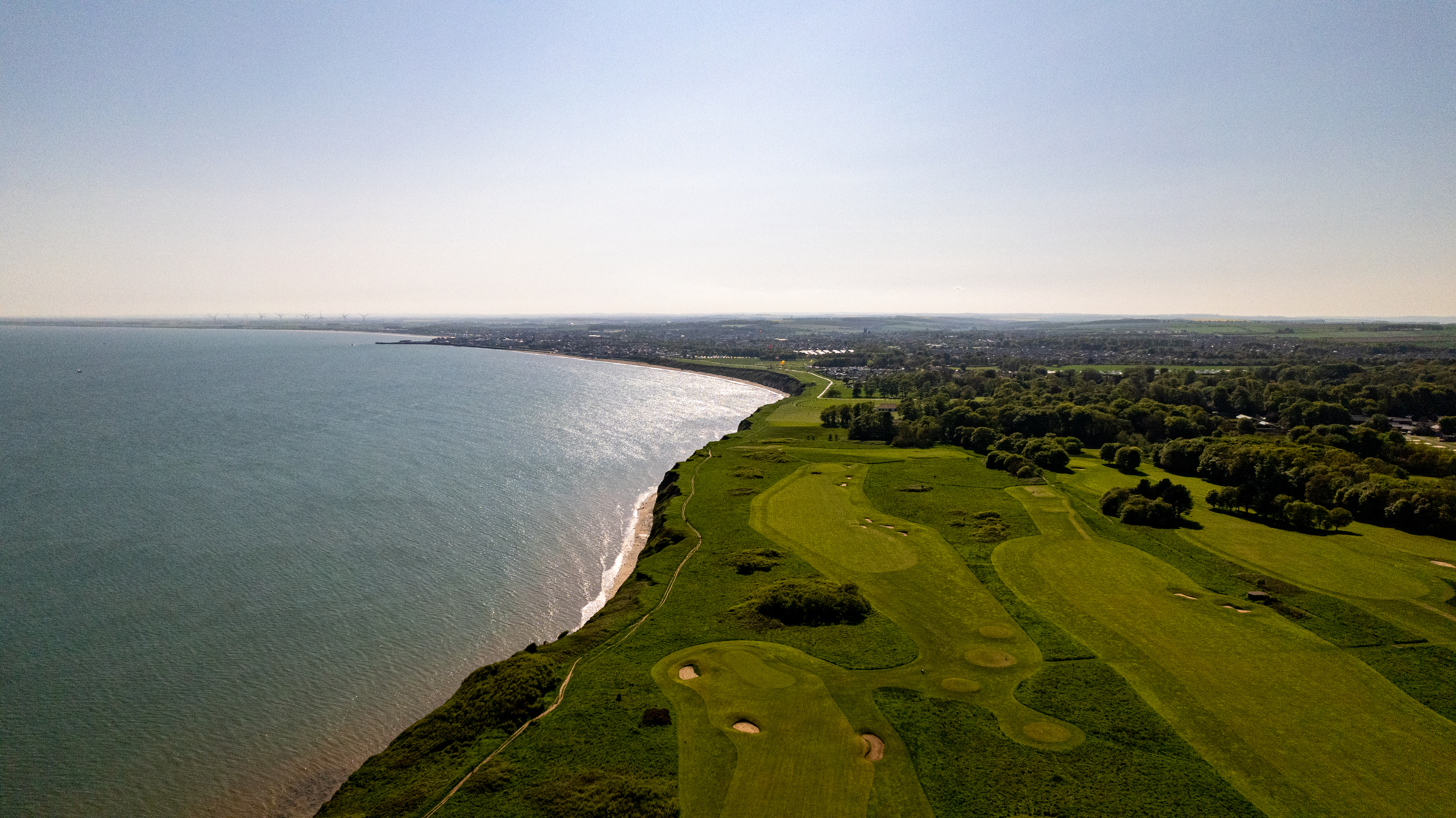 Aerial view of a coastal golf course with lush green fairways next to a calm sea under a clear sky in Flamborough, England