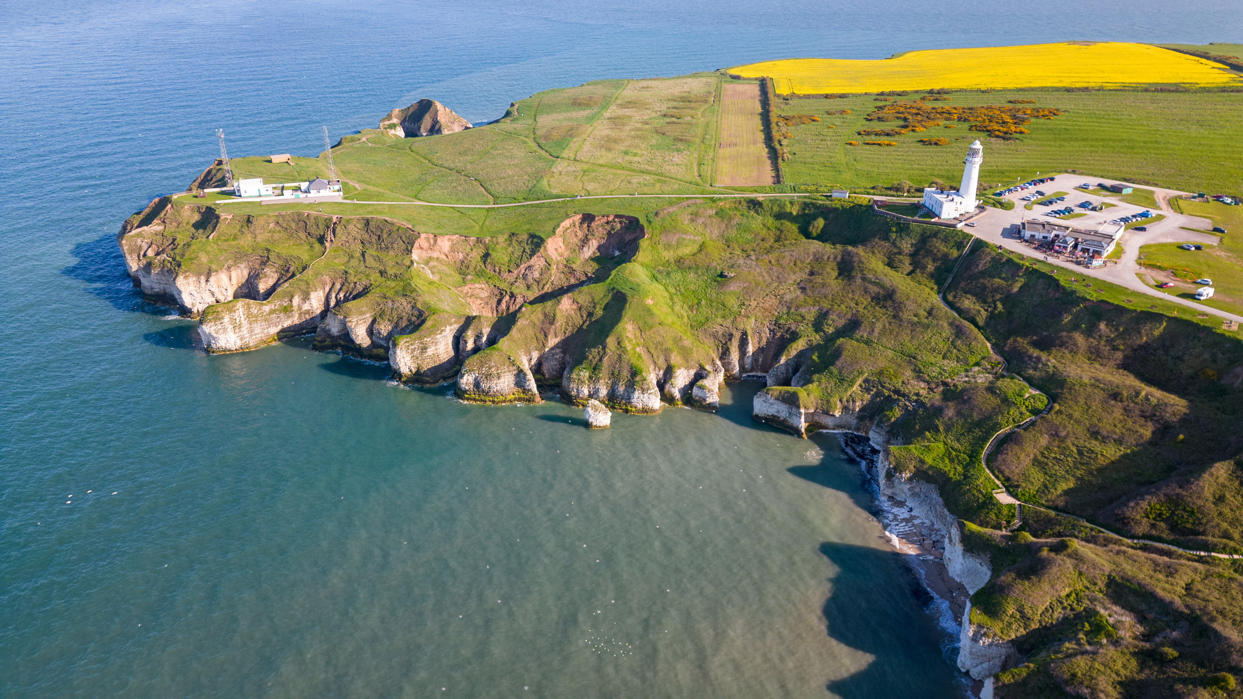 Aerial view of a coastal landscape with cliffs, a lighthouse, and a blooming yellow field under a clear blue sky in Flamborough, England