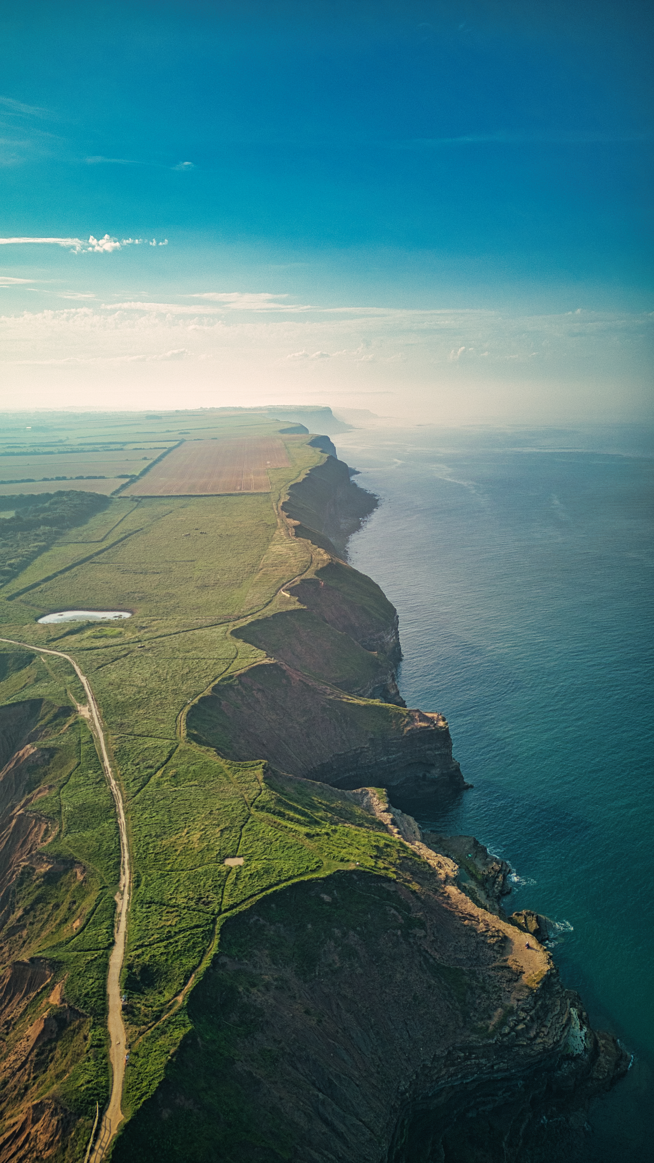 Aerial view of a coastal landscape with cliffs, ocean, and agricultural fields under a clear sky in Filey, England.