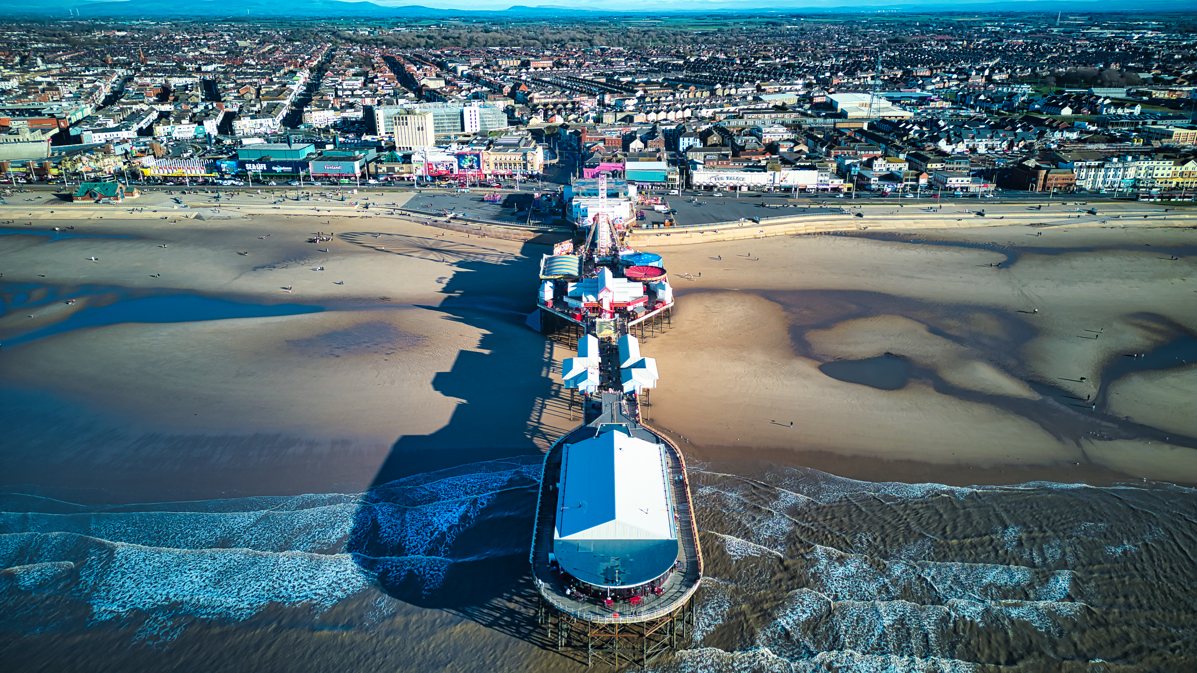 Aerial view of a coastal town with a pier extending into the sea, casting a long shadow on the sandy beach in Backpool, England.