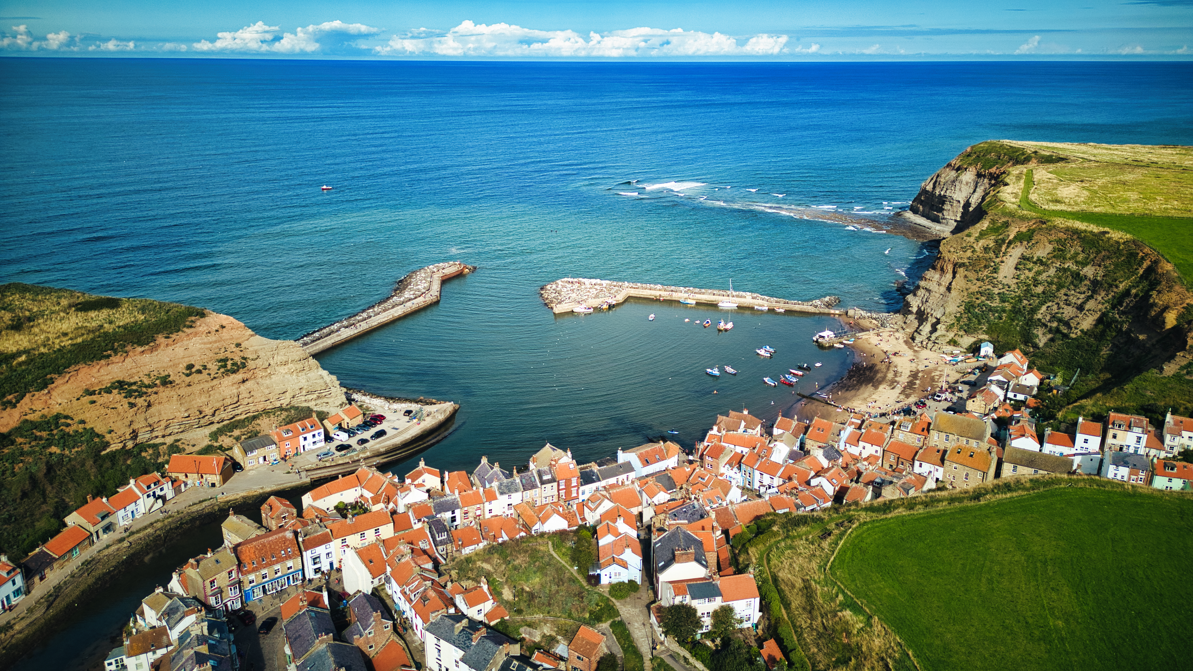 Aerial view of a coastal village with a harbor, red-roofed houses, and cliffs against a blue sea in Staithes, England.