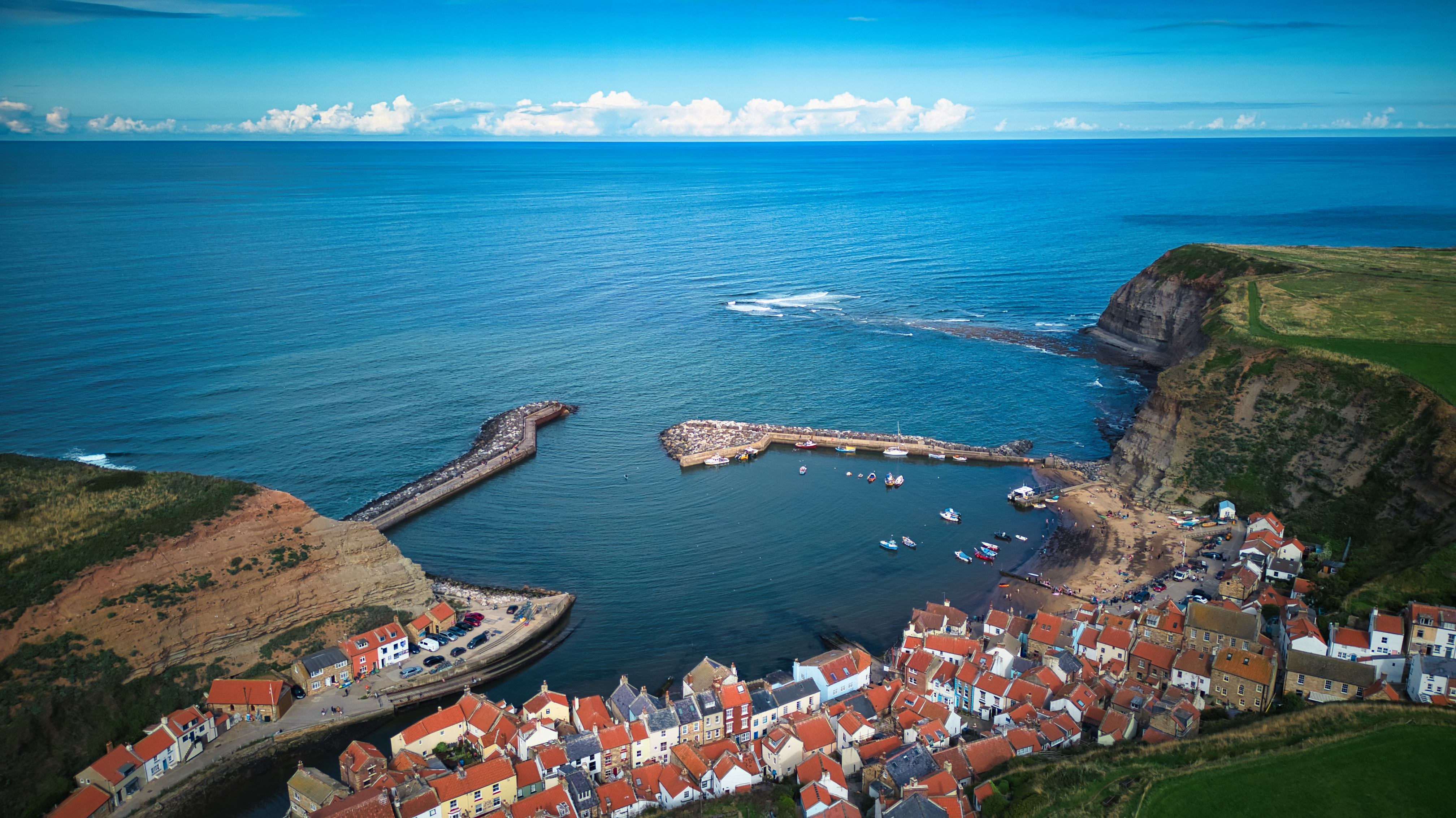 Aerial view of a coastal village with a harbor, surrounded by cliffs and the open sea under a clear blue sky in Staithes, England.