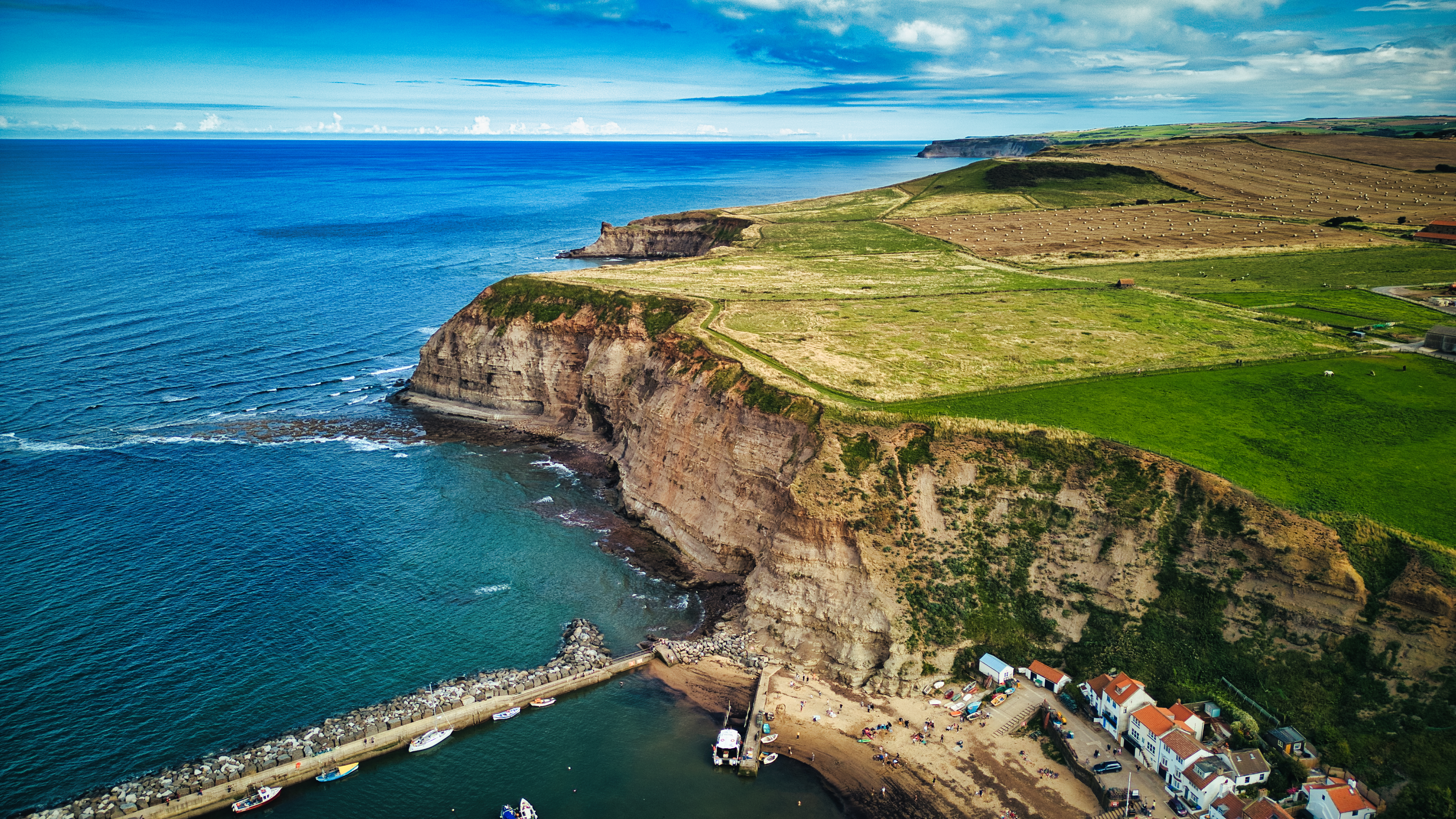 Aerial view of a coastal village with cliffs and farmland under a cloudy sky in Staithes, England.