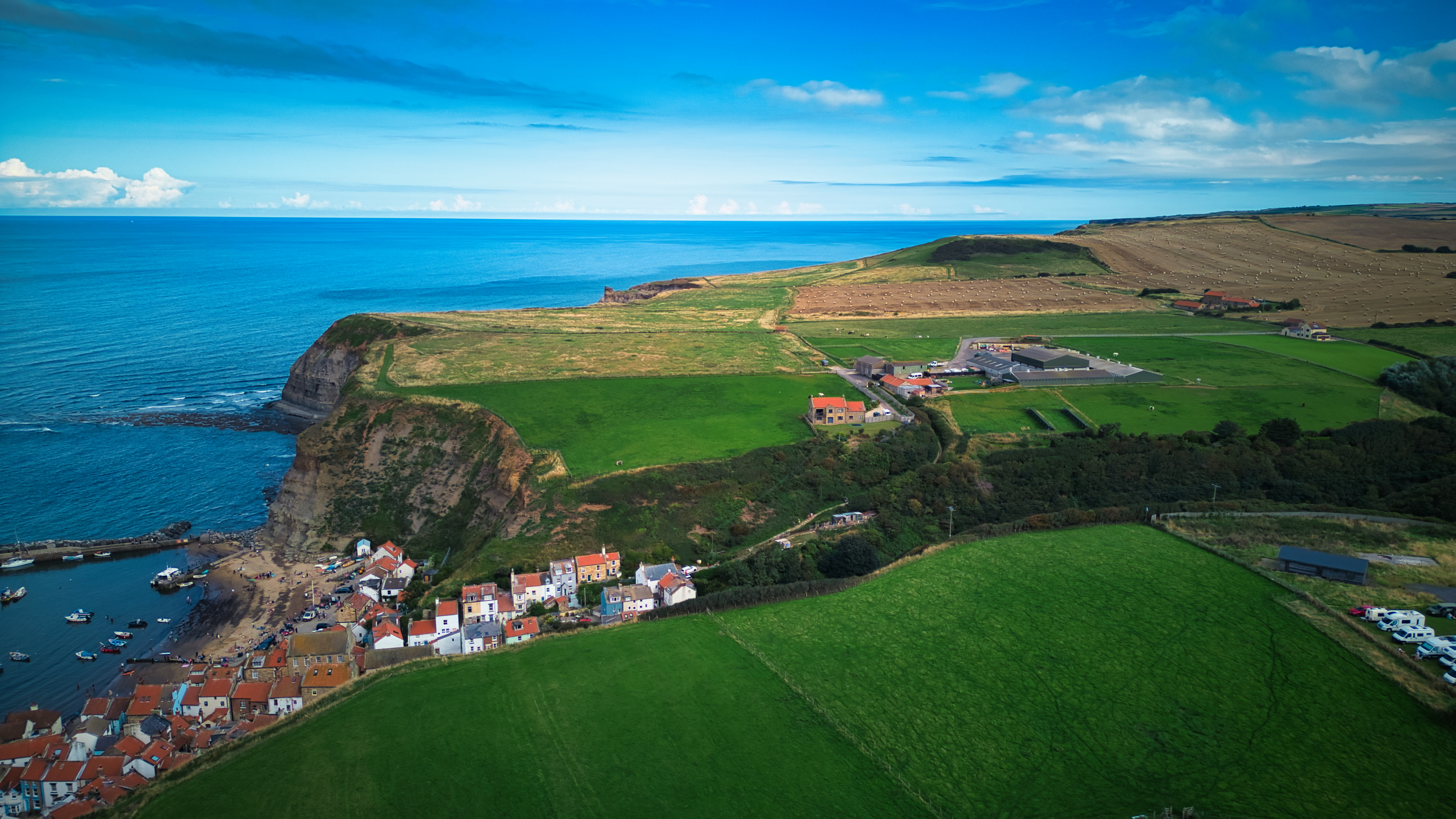 Aerial view of a coastal village with green fields, cliffs, and blue sea under a partly cloudy sky in Staithes, England.
