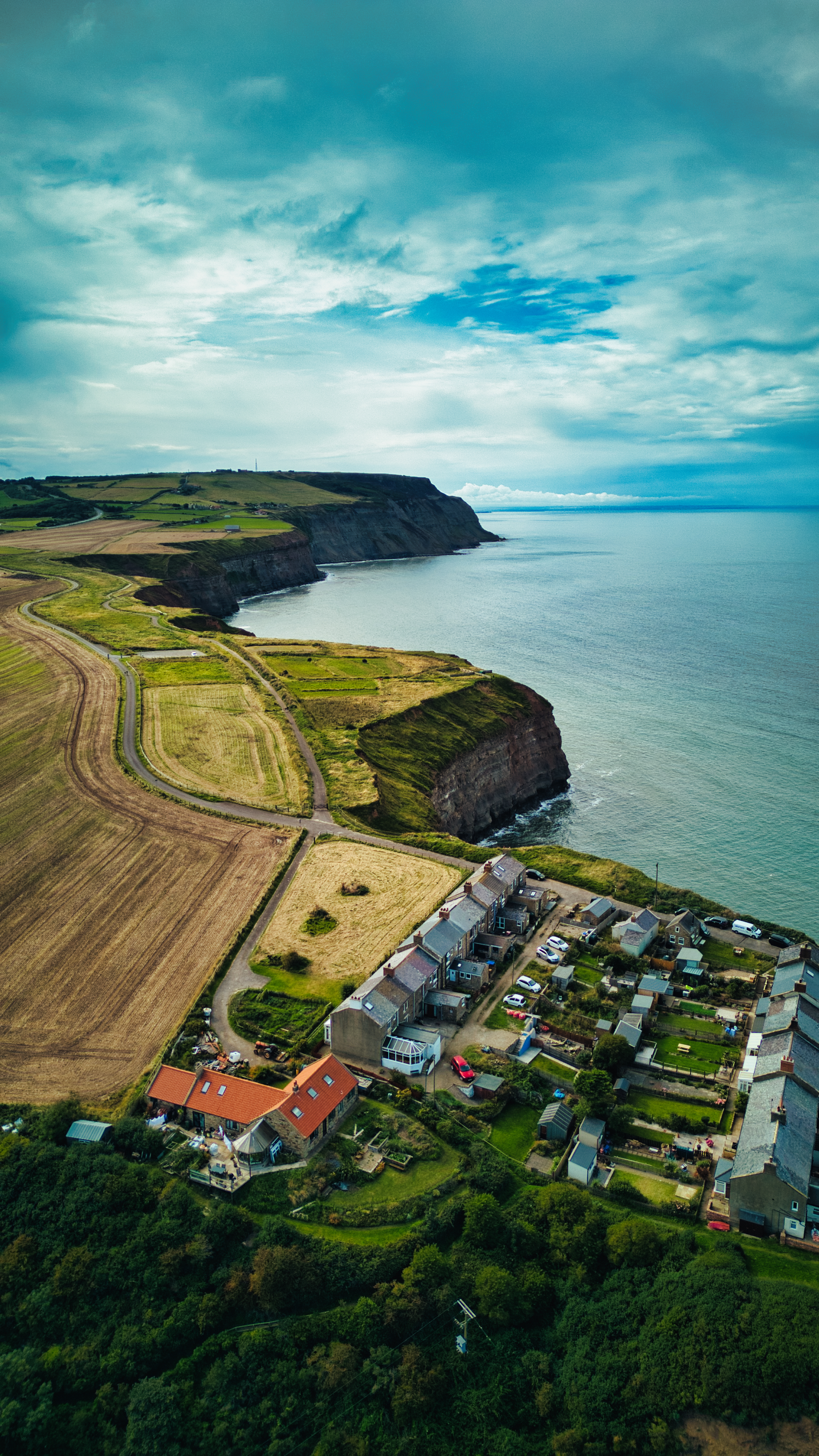 Aerial view of a coastal village with lush green fields and cliffs overlooking a calm sea under a cloudy sky in Staithes, England.