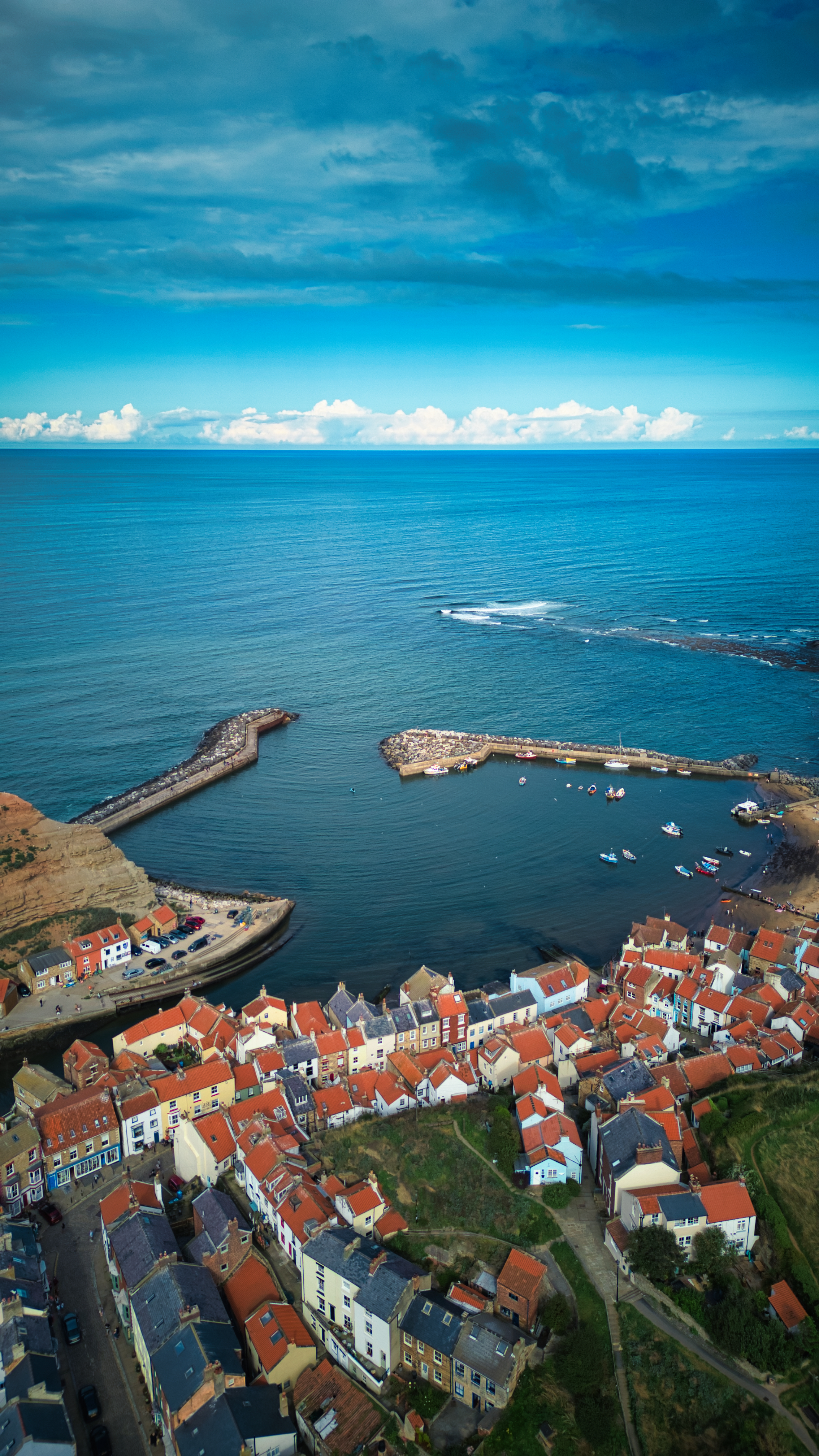 Aerial view of a coastal village with red rooftops, docks, and boats on a sunny day, with the deep blue sea meeting the horizon in Staithes, England.